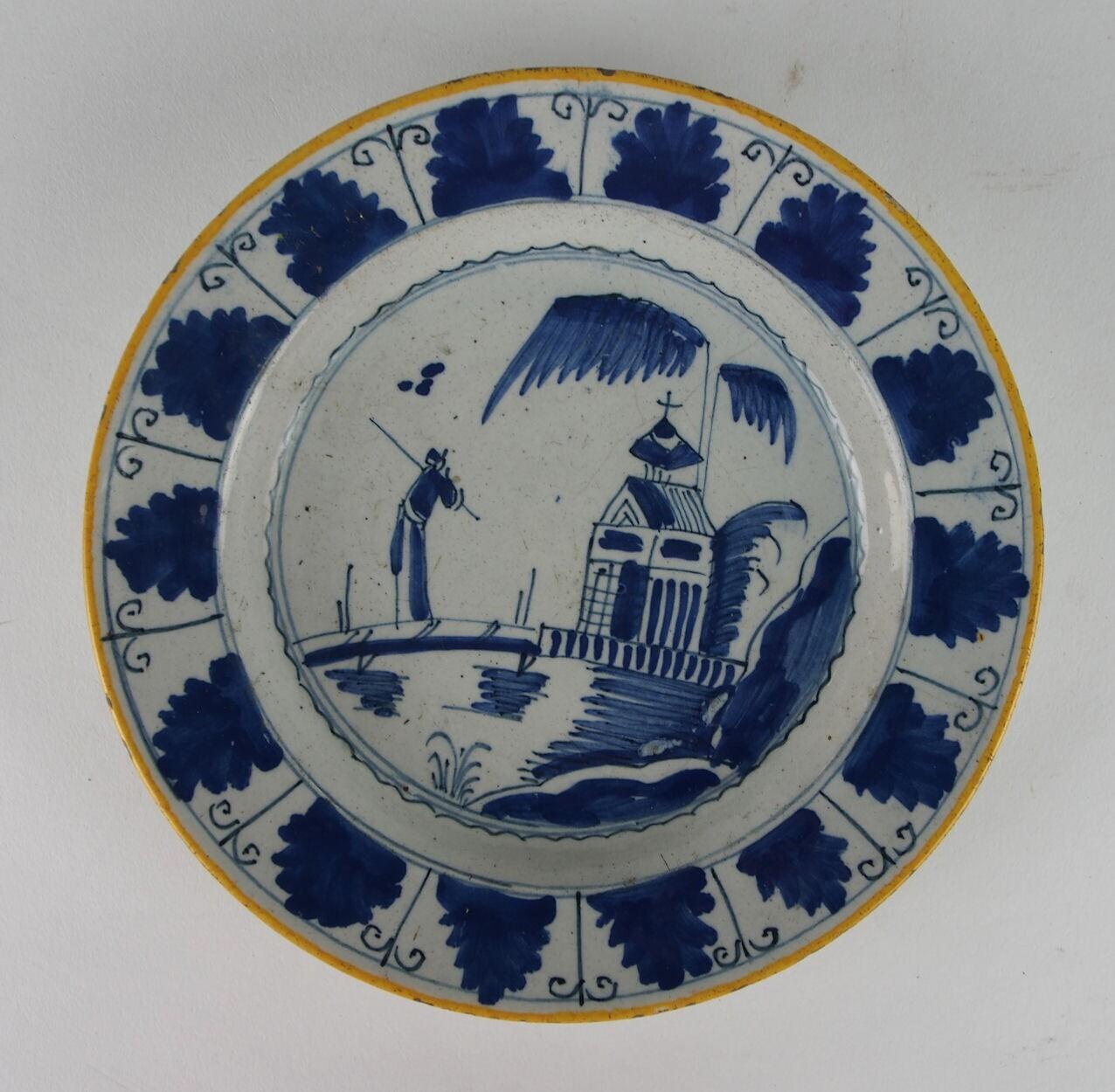 Beschildering in blauw met gele rand. Op het plat een Chinees bij een kerkje en water. Op de rand bladmotieven. (Nederlands)