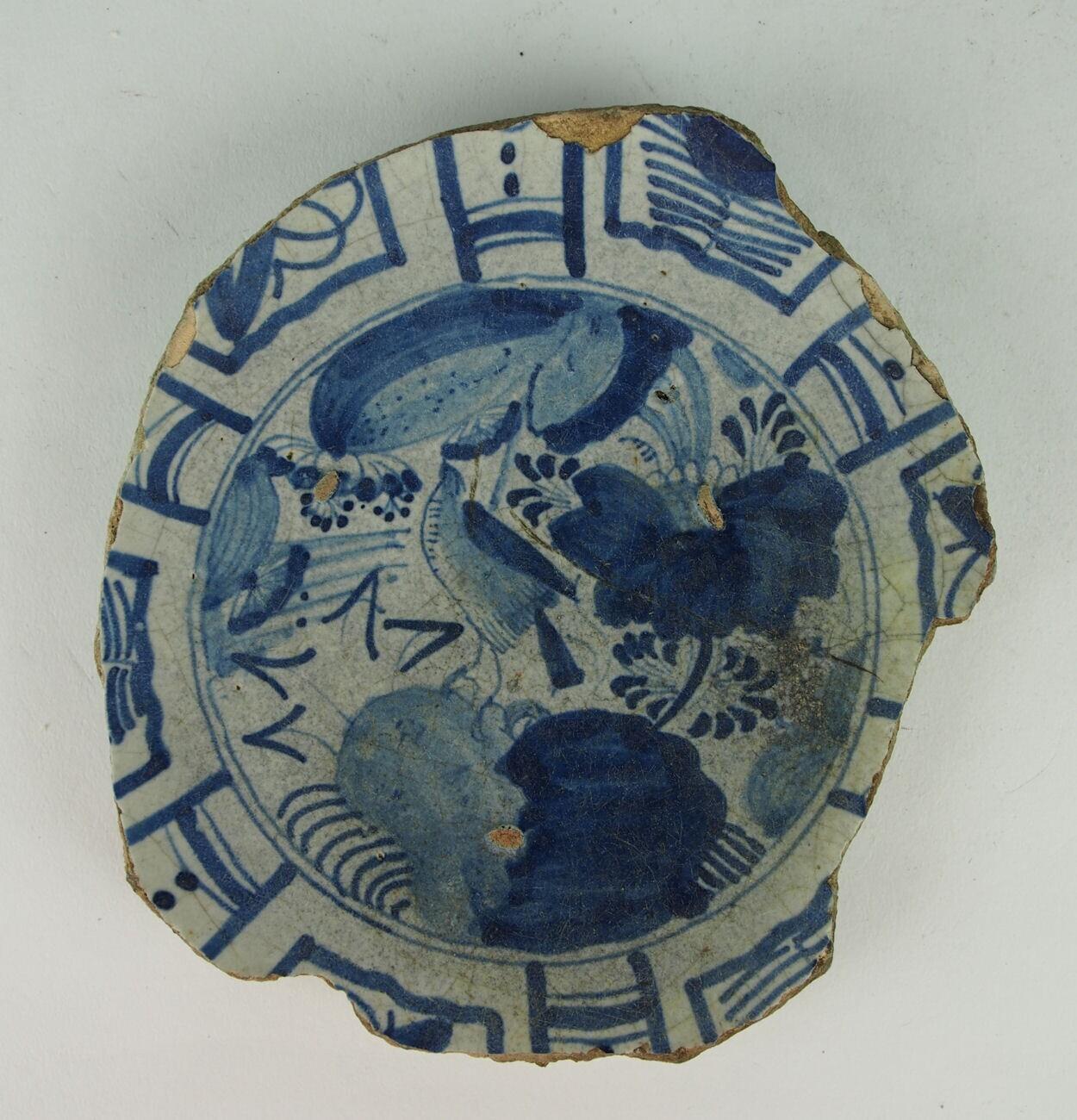 Majolica fragment met op de buitenwand groen loodglazuur. Beschildering in blauw. Op het plat een vogel op een rots met bloemmotieven. Op de wand vakken met bloemen en andere motieven in Wanli-stijl. Grijze scherf. (Nederlands)