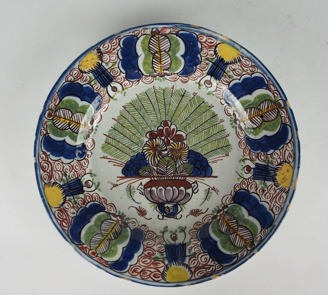 Rond pauwenbord met pauwenveren in een vaas. Op de rand halve bloemmotieven aan weerszijden van bladornament tegen een achtergrond van spiralen. Is gerestaureerd. Chips van de rand. (Nederlands)