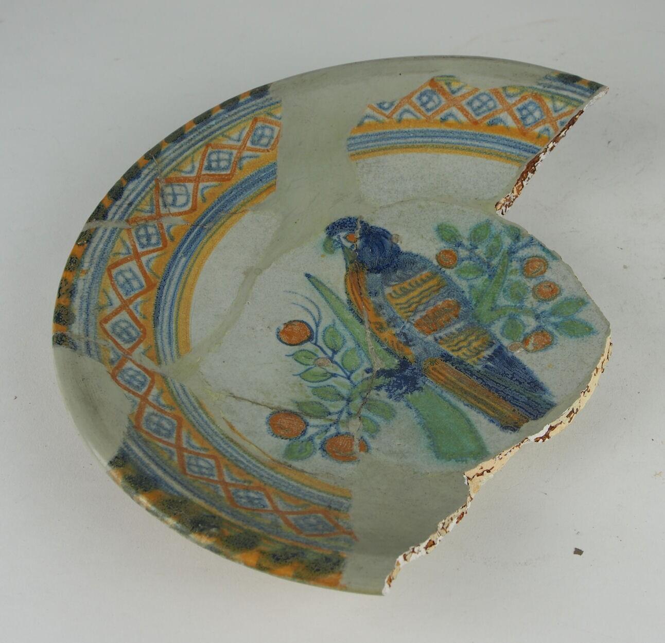 Rond bord met papegaai op bessentak. Op de wand zigzagmotief. Op de rand bladstreepjes. In vier stukken gebroken. Is gerestaureerd. (Nederlands)