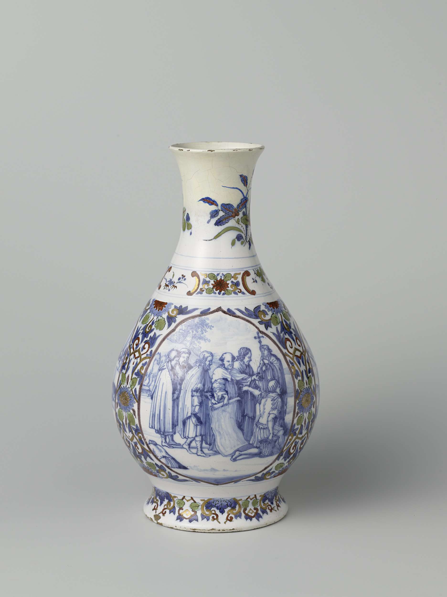 Vaas, flesvormig. De buik is rondom versierd met drie grote vignetten waarin blauw geschilderde taferelen ontleend aan een gravure van P.S. Bartoli (1635-1700) naar schilderingen van Juilio Romano in No Sala di Constantino in het Vaticaan. Tussen deze vignetten, op China geinspireerde horizontale randen van bloem-, blad- en bandmotieven in rood, groen, blauw en goud. Op voet en schouder dergelijke horizontale "Hoppesteijn-randen". Op de hals twee bloembouquetten. Gemerkt met het monogram W beschouwd als dat van Jacob Wemmersz. Hoppesteijn van 1664-1674, eigenaar van 't Jonge Moriaanshoofd". De hals van de vaas is gerestaureerd. (Nederlands)