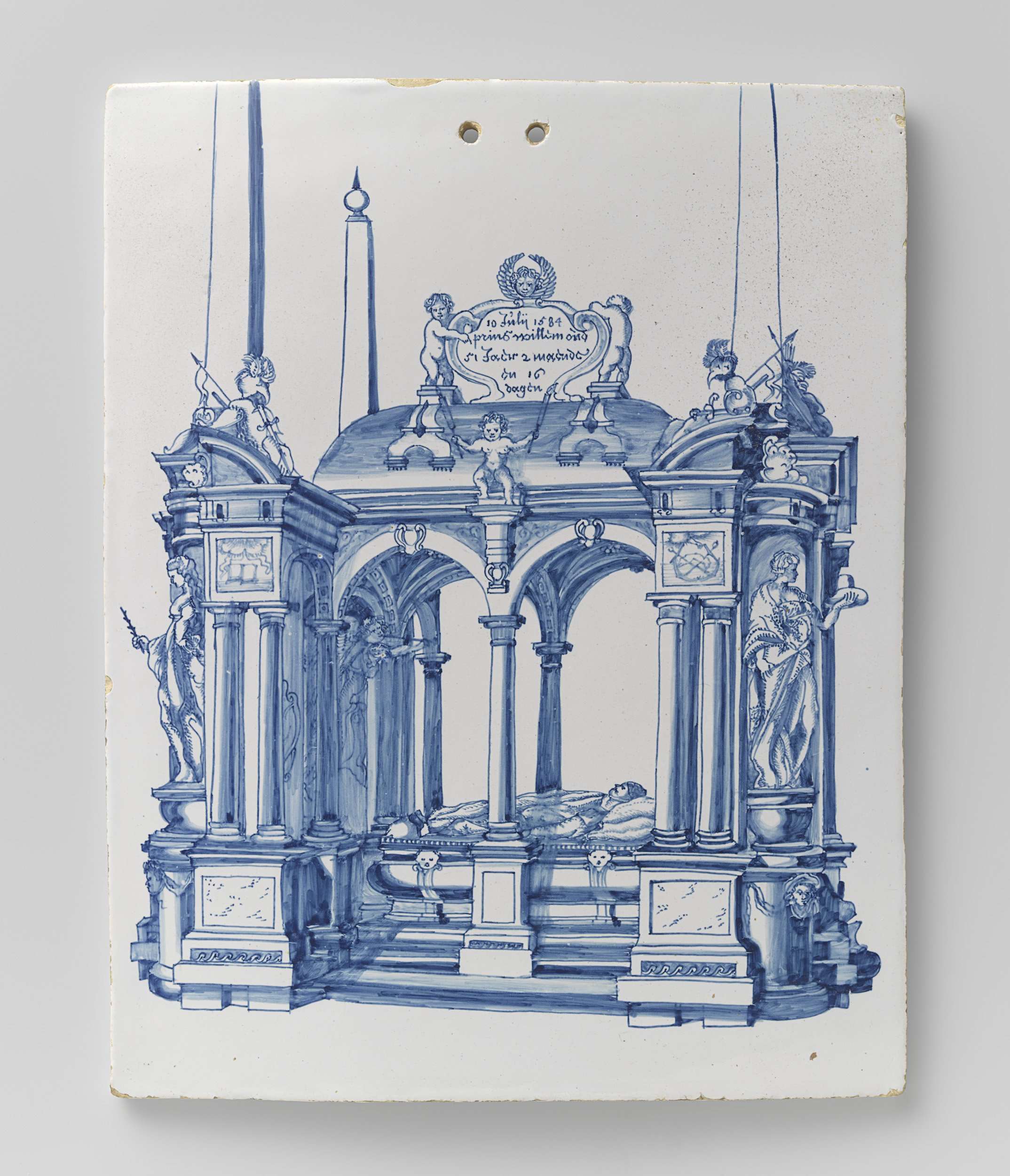 Plaat van faïence, beschilderd in blauw met een zijaanzicht van het graf van Willem van Oranje (de Zwijger) in de Nieuwe Kerk te Delft. (Nederlands)