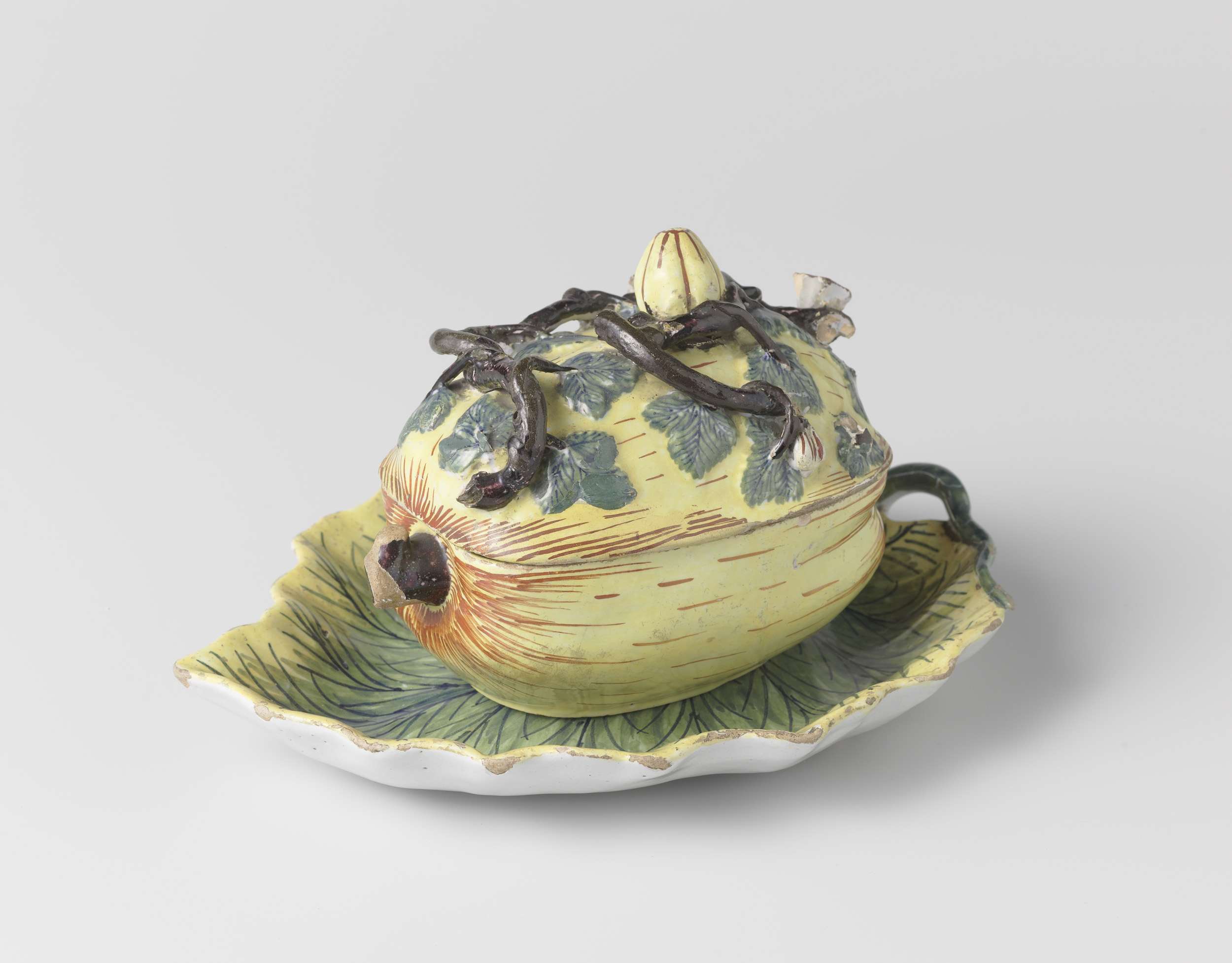 Terrine van veelkleurig beschilderde faience, in de vorm van een pompoen (Nederlands)