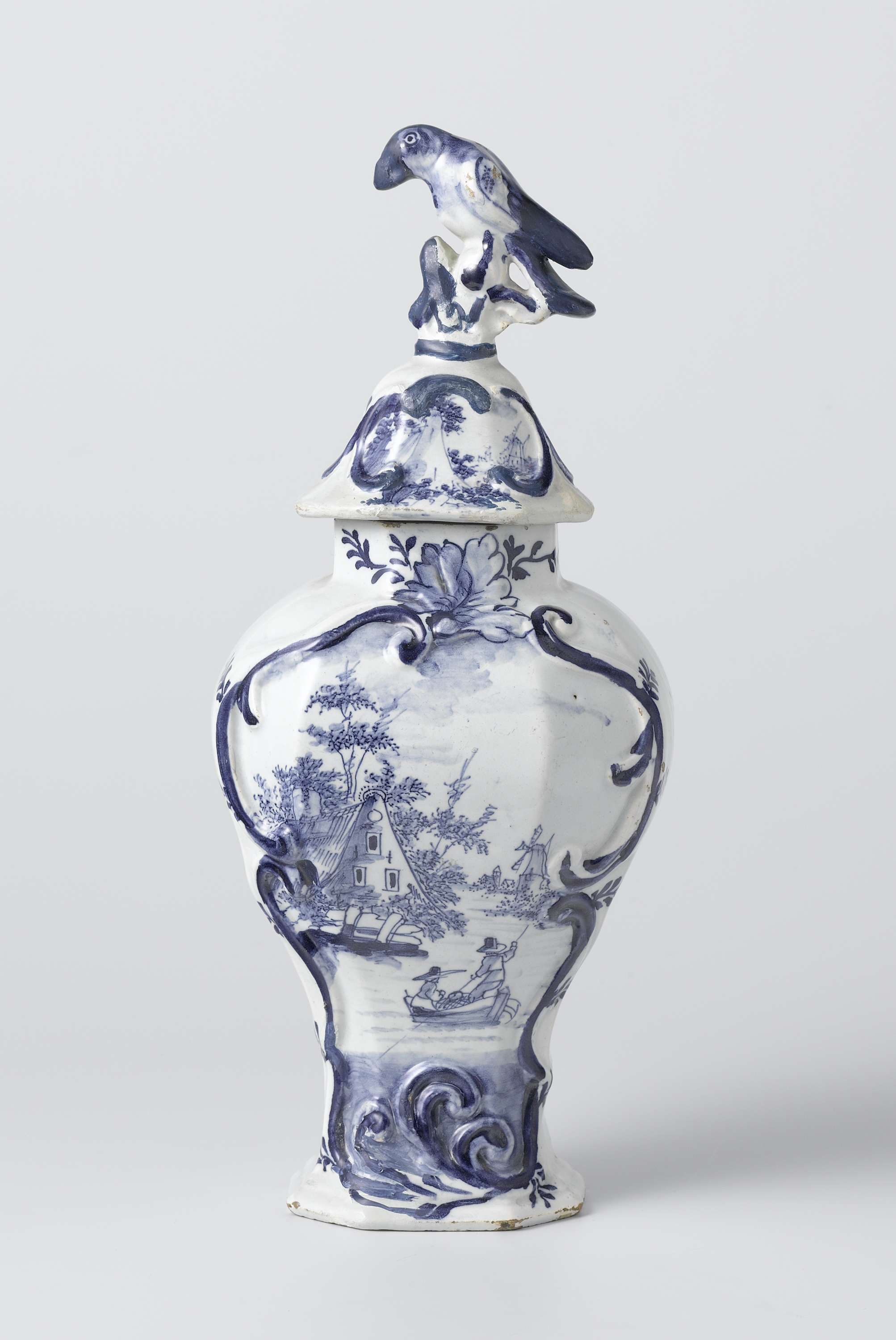 pot met deksel van faience. Blauw beschilderd met een Nederlands waterlandschap. (Nederlands)