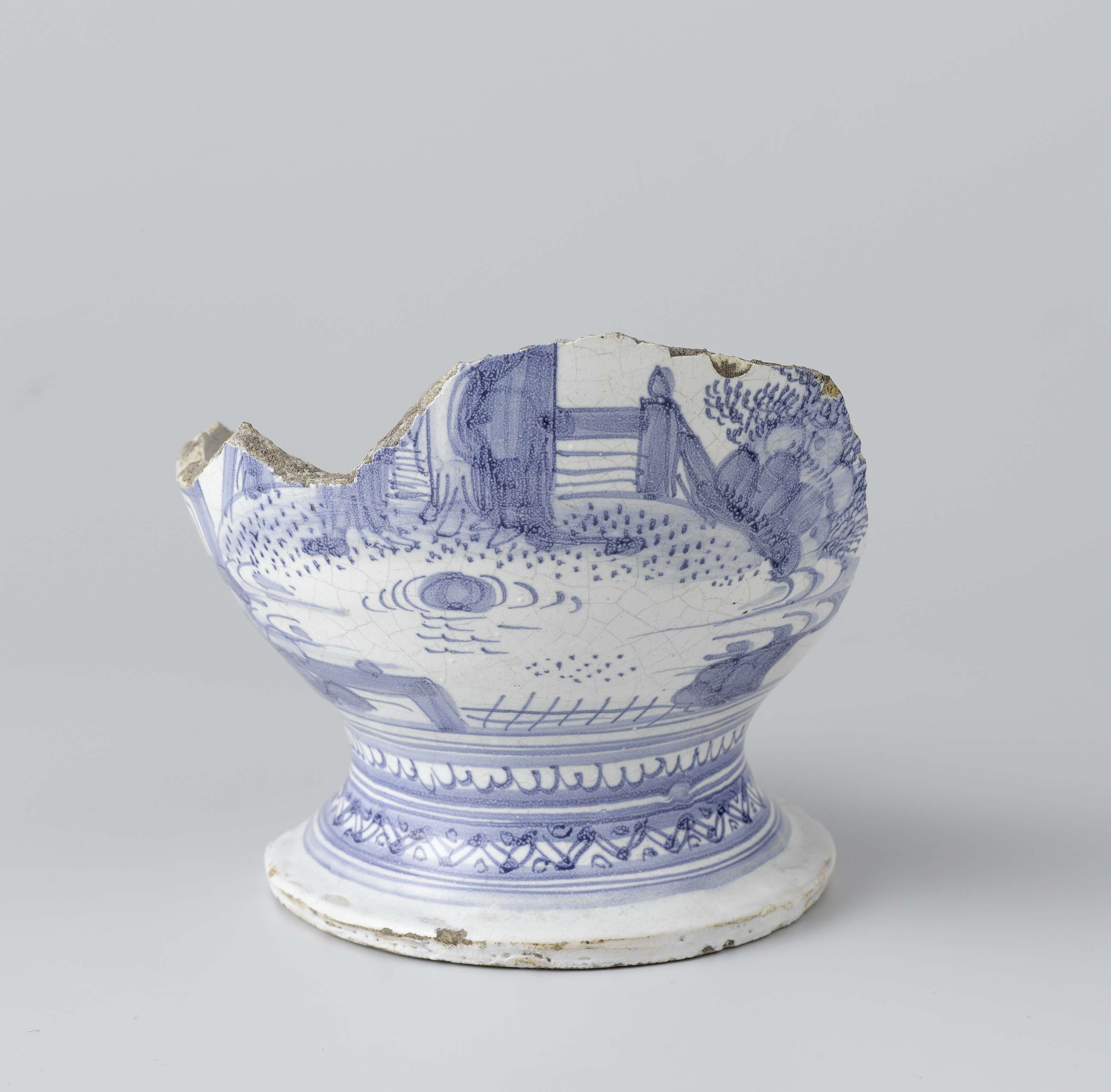 Fragment van een vaas van blauw beschilderde faience, waarschijnlijk beschilderd met Chinezen in een landschap. Het fragment is een bodemvondst uit Delft. (Nederlands)
