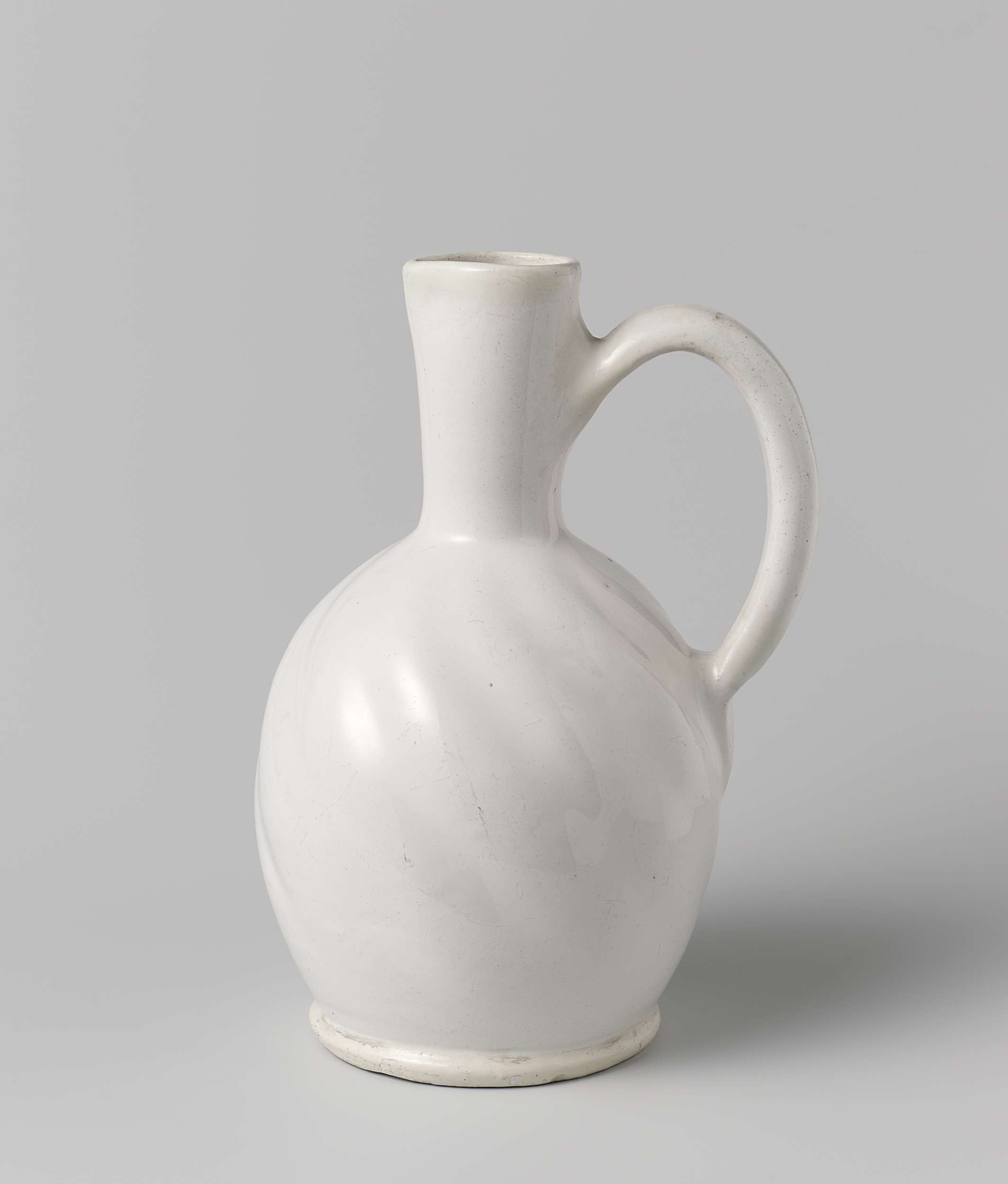 Ronde kan van ongedecoreerde faience, op een standring. De wand van de kan is door diagonale insnoeringen licht gelobd en de smalle cilindrische hals heeft een licht ingekenpen sneb. Het oor is c-vormig. (Nederlands)