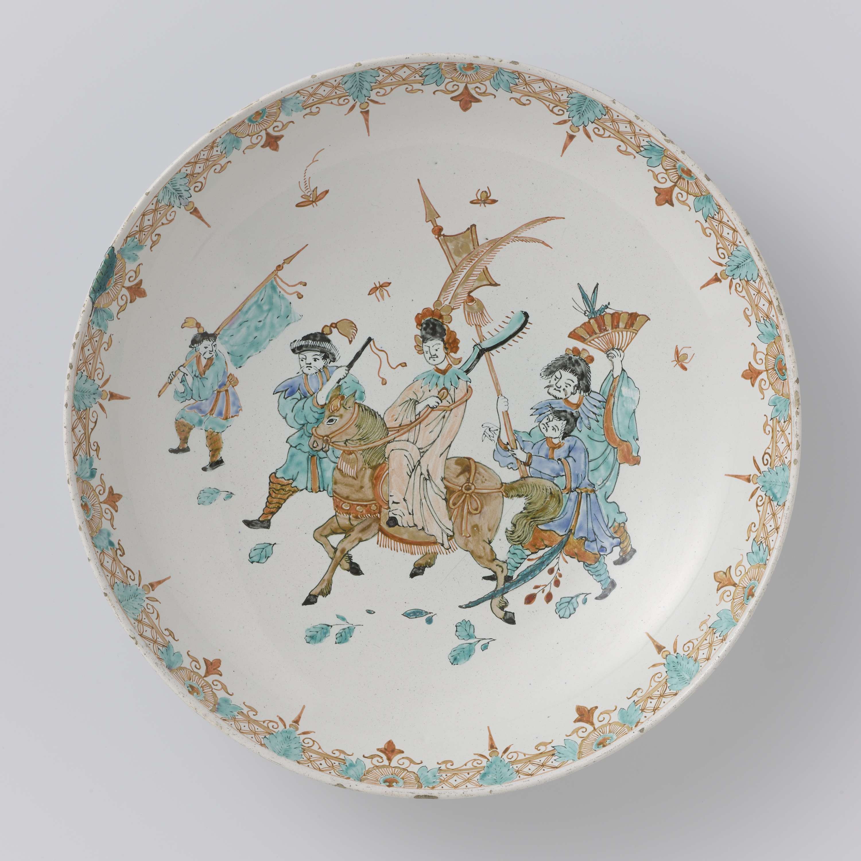 Schotel, beschilderd met oosterse figuren, waaronder een prinses te paard (Nederlands)