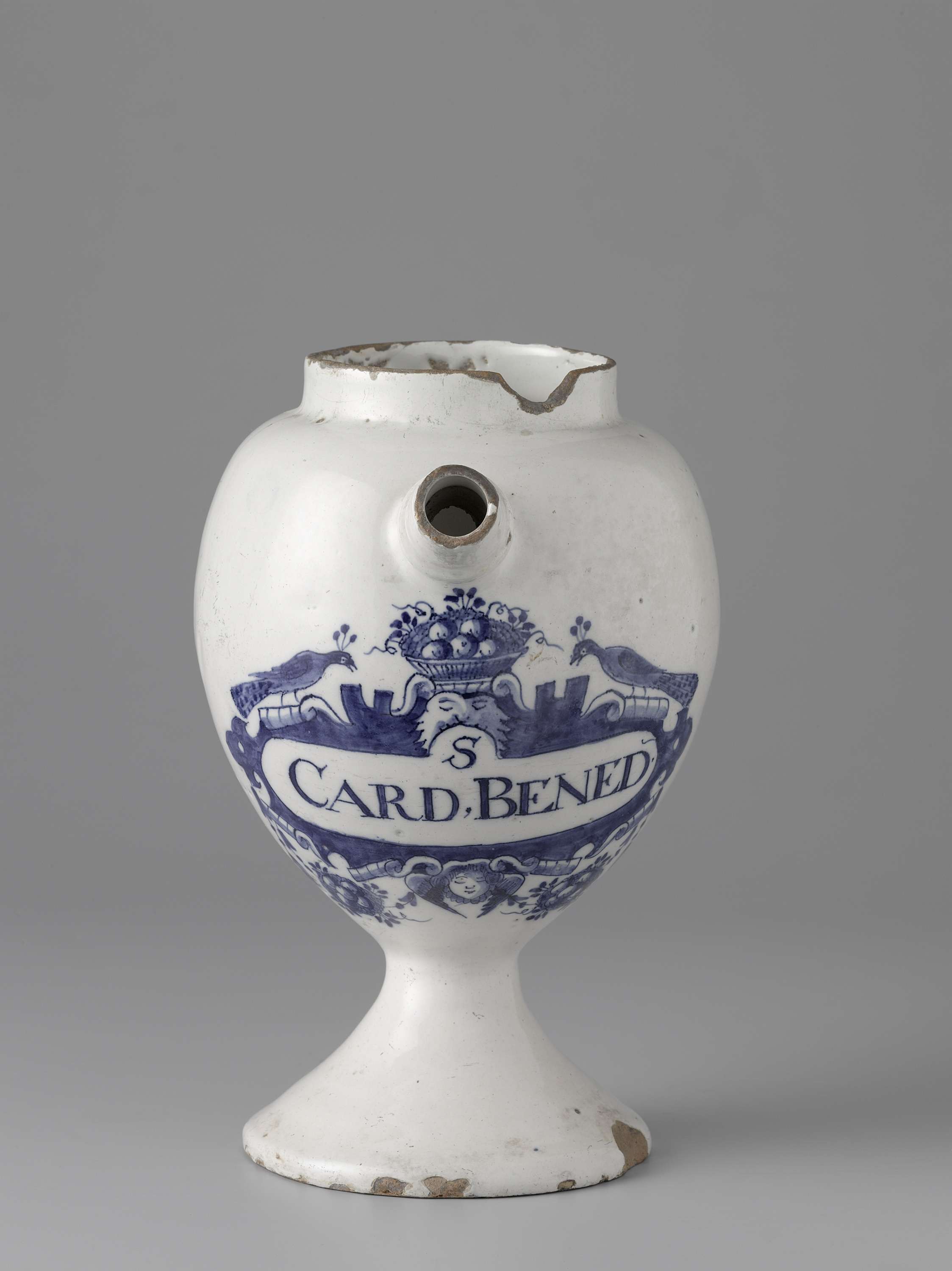 Apothekerspot van faience. Met oor en tuit en blauw beschilderd etiket met opschrift: S/ CARD.BENED (Nederlands)