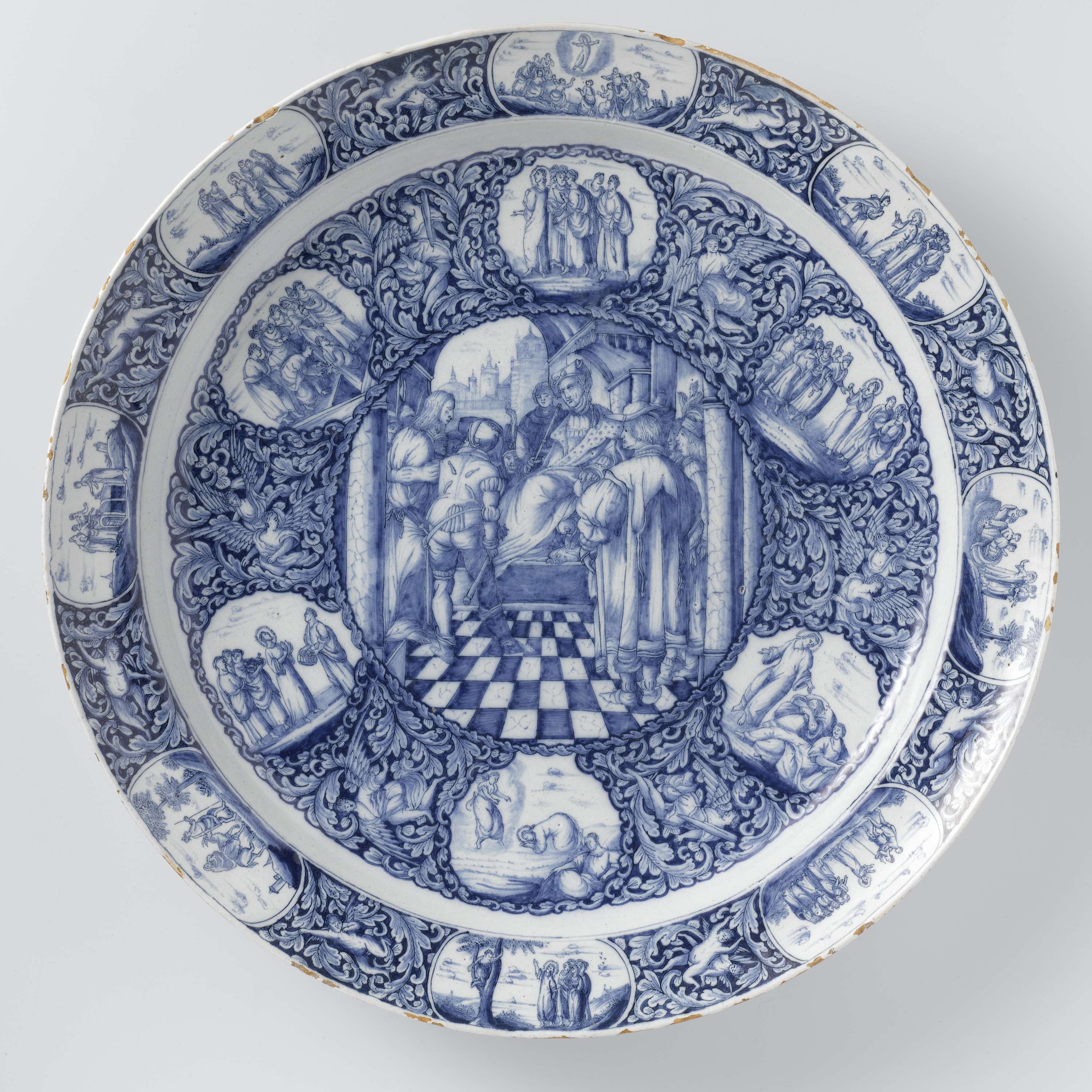 Schotel van faïence, beschilderd in blauw met vijftien scènes uit het leven van Christus. Midden op het plat Christus voor Kajafas. (Nederlands)