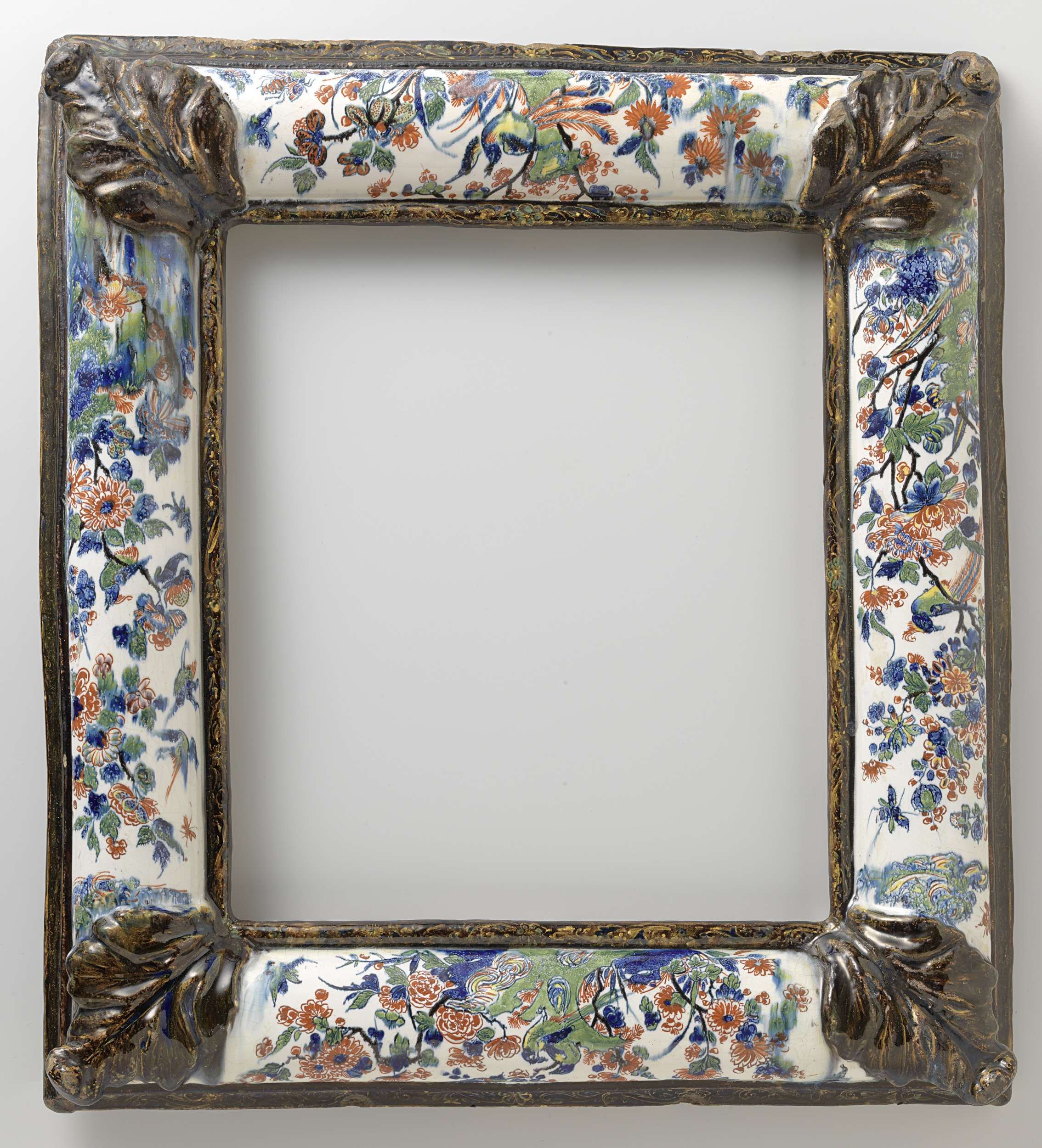 Spiegellijst van faience. Veelkleurig beschilderd met bloemtakken en vogels. Op de hoeken acanthusbladeren in relief. Het bolle deel van de lijst is beschilderd in blauw, rood, groen, geel en mangaanpaars met rotsen, waaruit bloeiende planten ontspruiten; vogels op de takken. De randen zijn beschilderd in geel, groen en blauw met ranken op zwartbruine grond. De acanthusbladeren zijn eveneens zwartbruin met groene, blauwe en gele vlekken en strepen. De achterzijde van de lijst is hol en vertoont in het midden tussenschotten. (Nederlands)