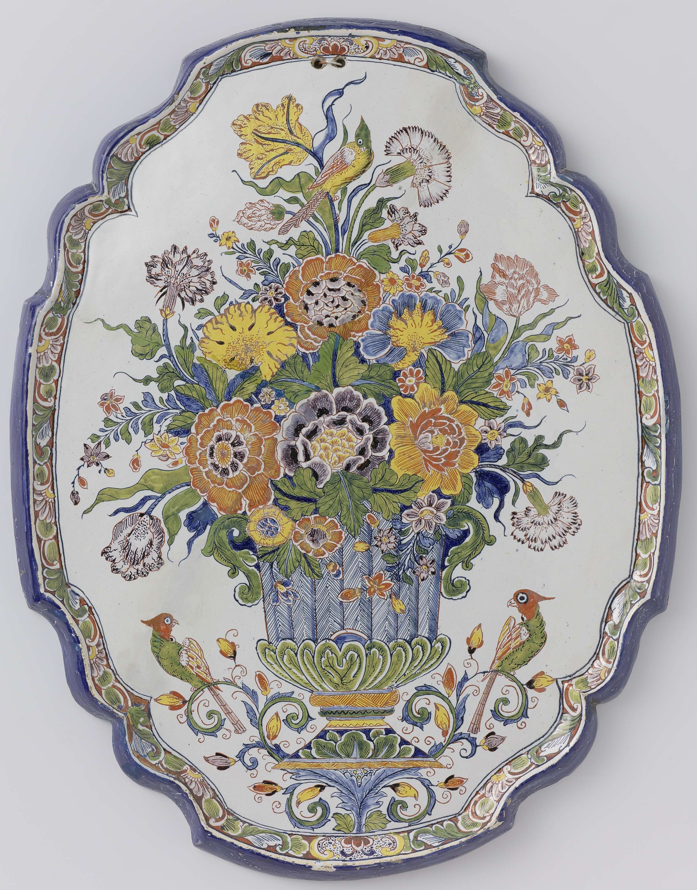 Plaat, ovaal met uitgeschulpte rand, van faïence. Veelkleurig beschilderd met een vaas met bloemen. (Nederlands)
