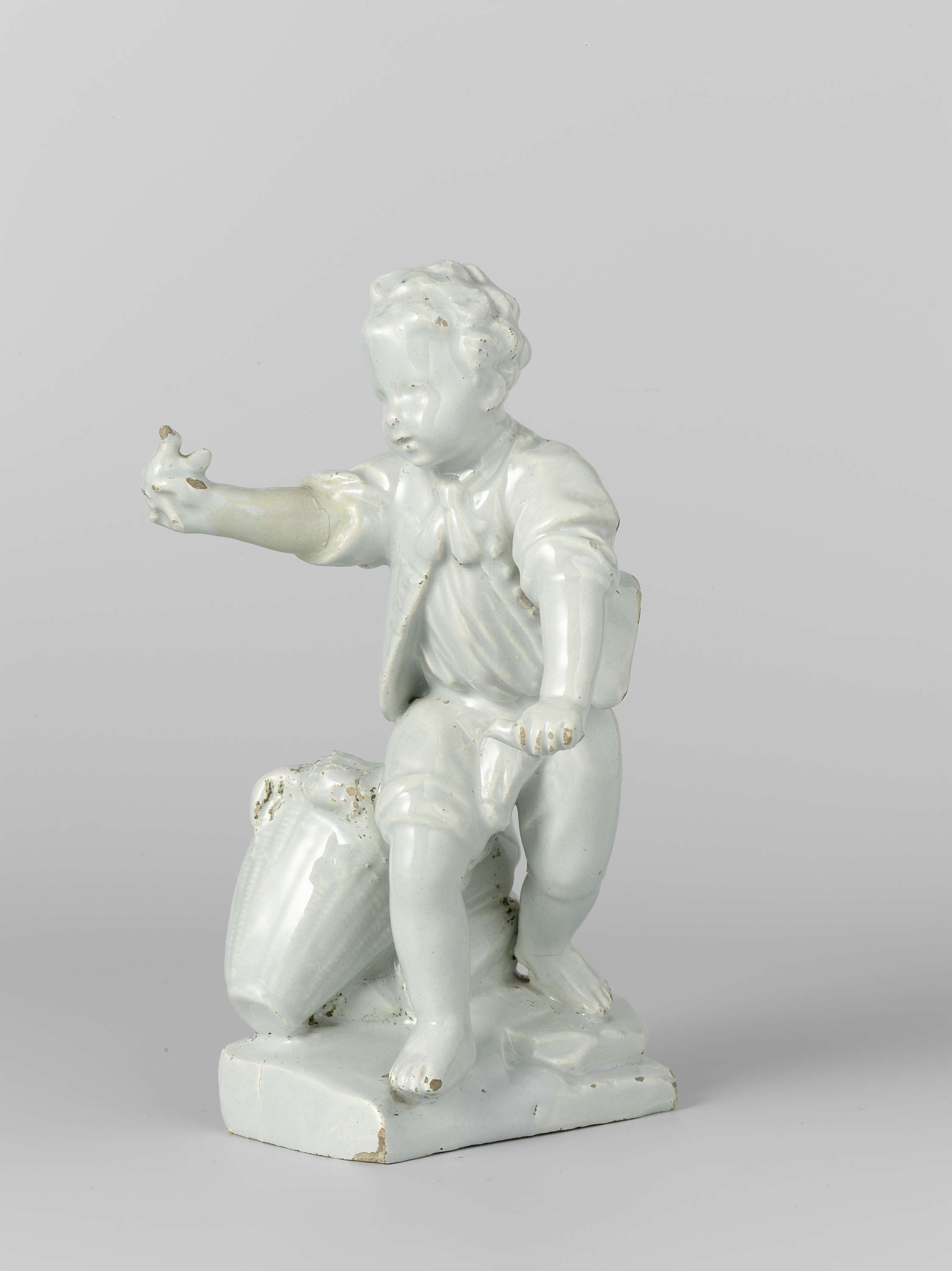Mannenfiguur van faience, in de vorm van een herder met een vogel. Wit geglazuurd. (Nederlands)