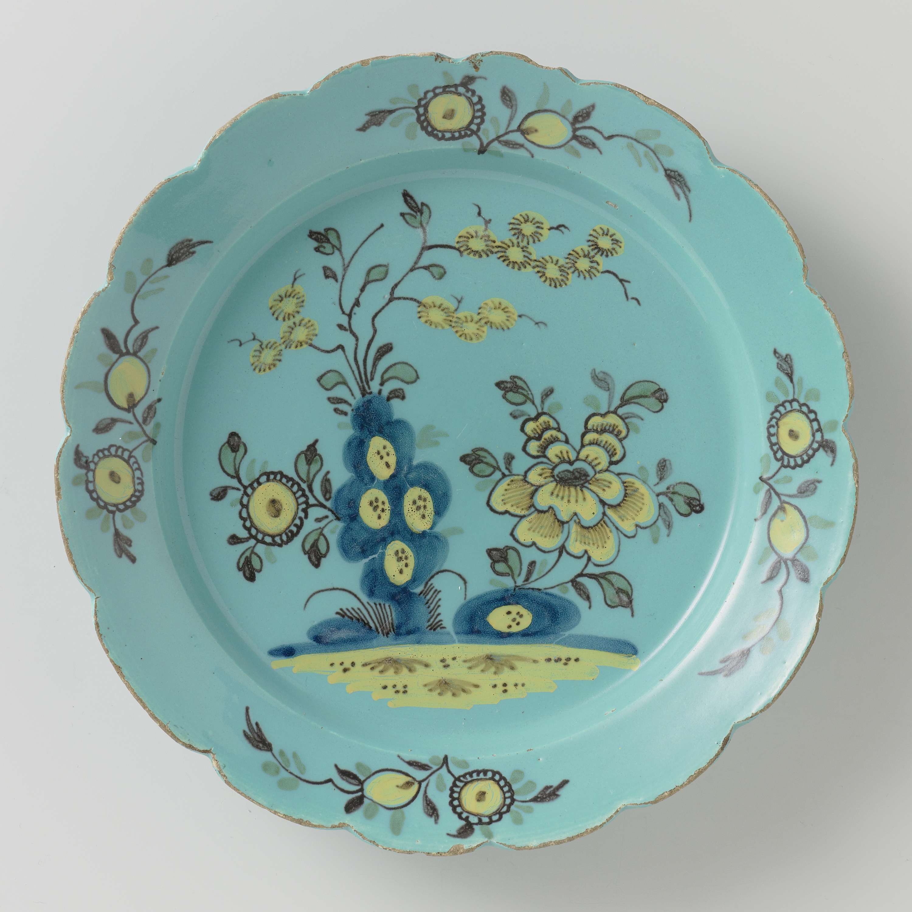 Rond bord van veelkleurig beschilderde faience, met een turkoois fonde en een geschulpte rand. Op het plat zijn bloemen op een grond in de kleuren blauw, geel en mangaan geschilderd. Op de rand zijn vier bloemmotieven geschilderd in de kleuren groen, geel en mangaan. (Nederlands)