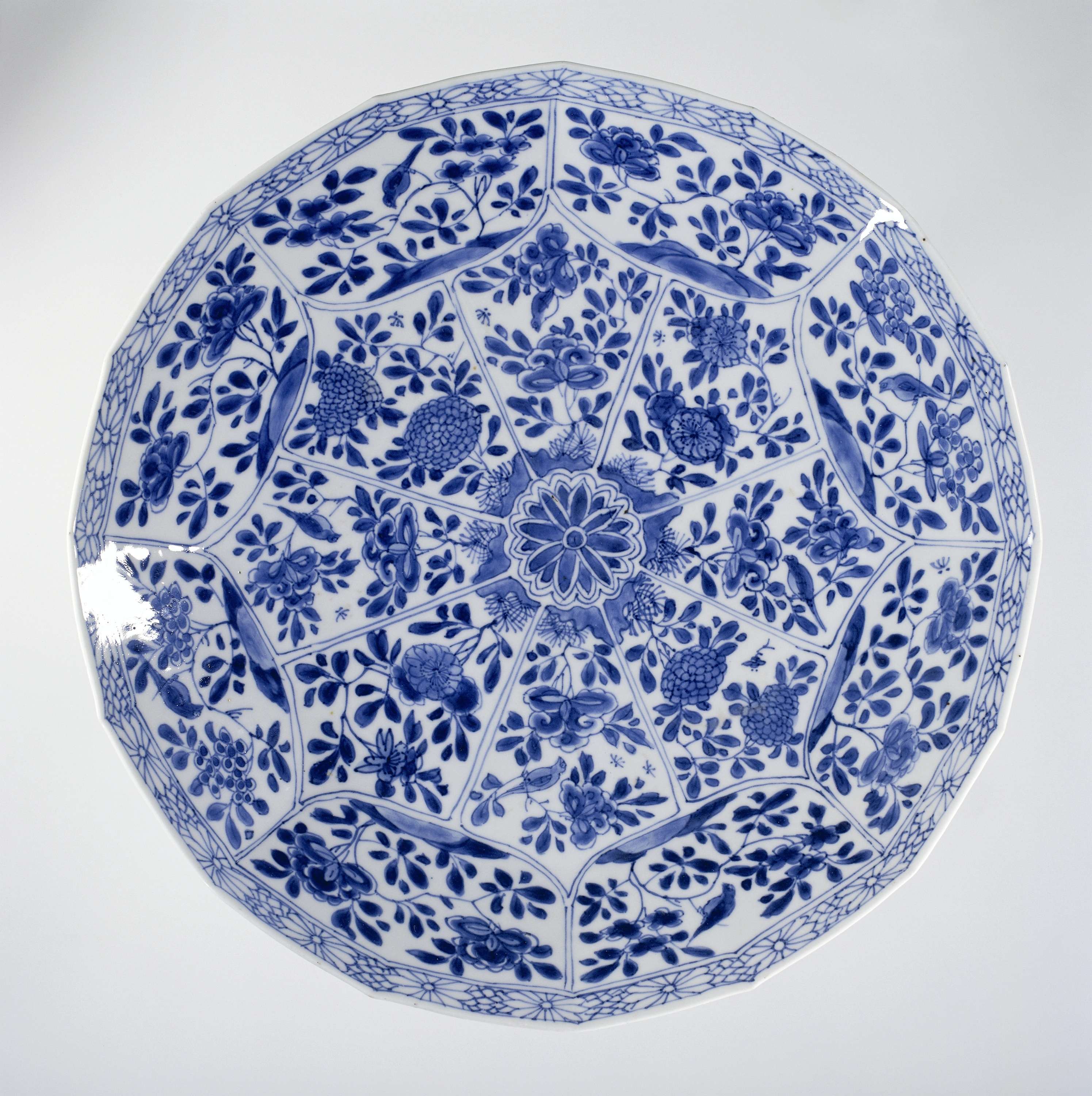 Schaal van porselein met schuine, achthoekige wand, beschilderd in onderglazuur blauw. Op het plat een gestileerde chrysant omgeven door acht uitstralende vakken gevuld met verschillende bloeiende planten op een rots met vogels; de wand verdeeld in acht vakken met verschillende bloemtakken op een rots en vogels; de rand met een geometrisch motief. De achterzijde verdeeld in acht vakken met fruittak en vogel. Gemerkt op de onderzijde met een schelp in een dubbele cirkel. Blauw-wit. (Nederlands)