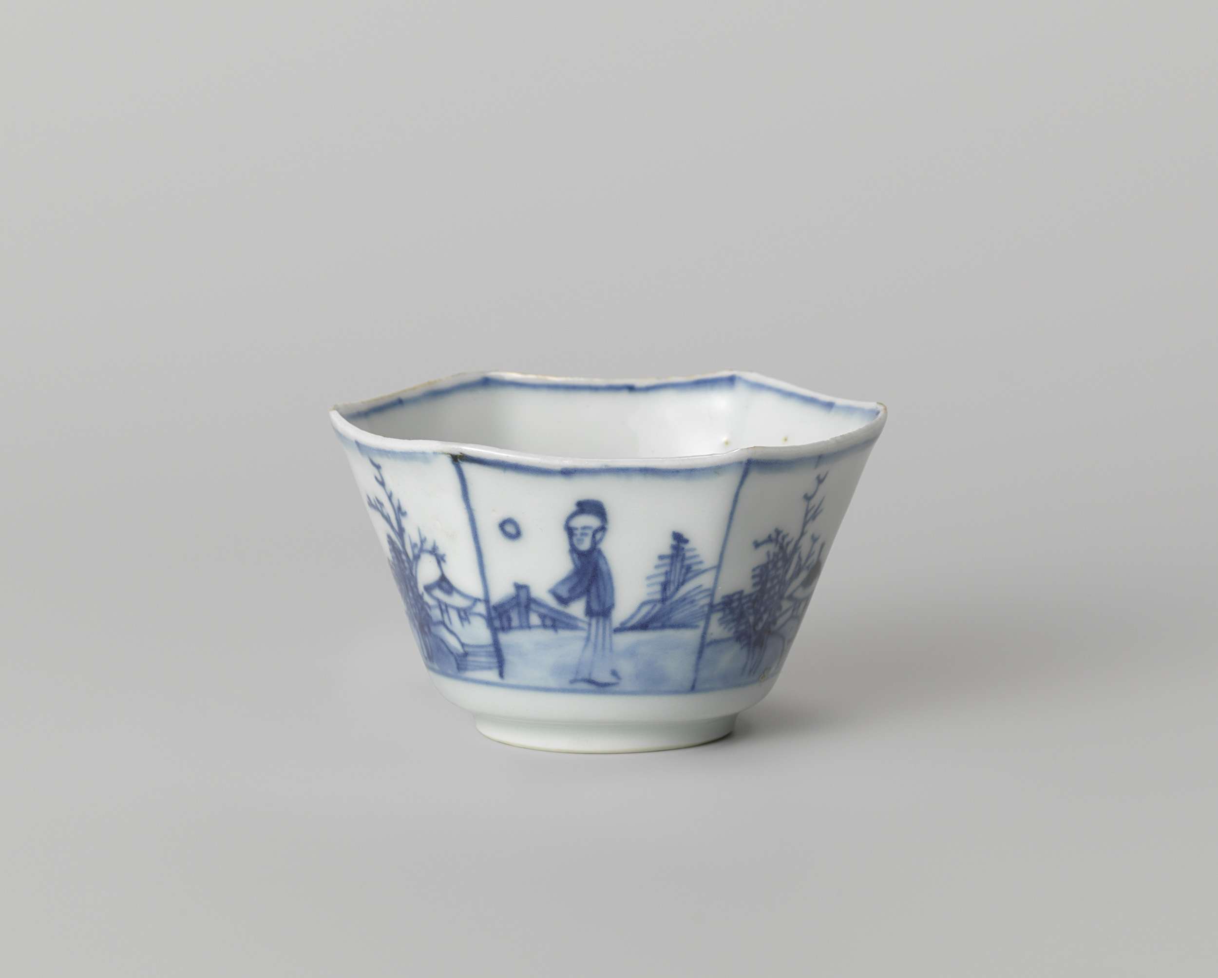 Zeshoekige kop van porselein, beschilderd in onderglazuur blauw. Op de bodem een rivierlandschap met paviljoens, bomen en een persoon; de buitenwand is verdeeld in zes vakken met afwisselend een persoon bij een hek en een rivierlandschap met een paviljoen en bomen. Blauw-wit. (Nederlands)