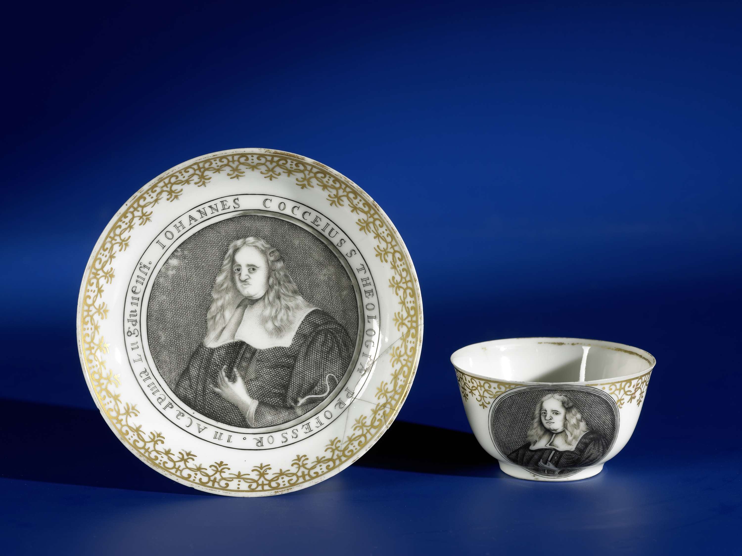 Klokvormige kop en schotel van porselein, beschilderd op het glazuur in zwart en goud. Op het plat een medaillon met het portret van Johannes Cocceius met daaromheen het opschrift 'IOHANNES COCCEIUS THEOLOGIA PROFESSOR IN ACADEMIA LUGDUNENSI'; op de binnenrand een band met ranken in Meissen-stijl. De kop met dezelfde decoratie, met het opschrift 'IOANNES COCCEIUS'. Europese voorstelling in encre de Chine. (Nederlands)