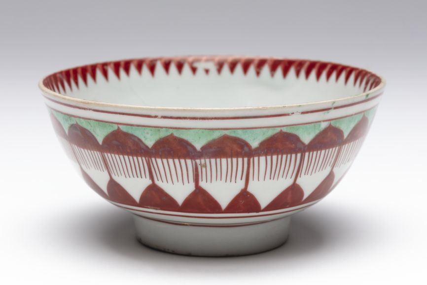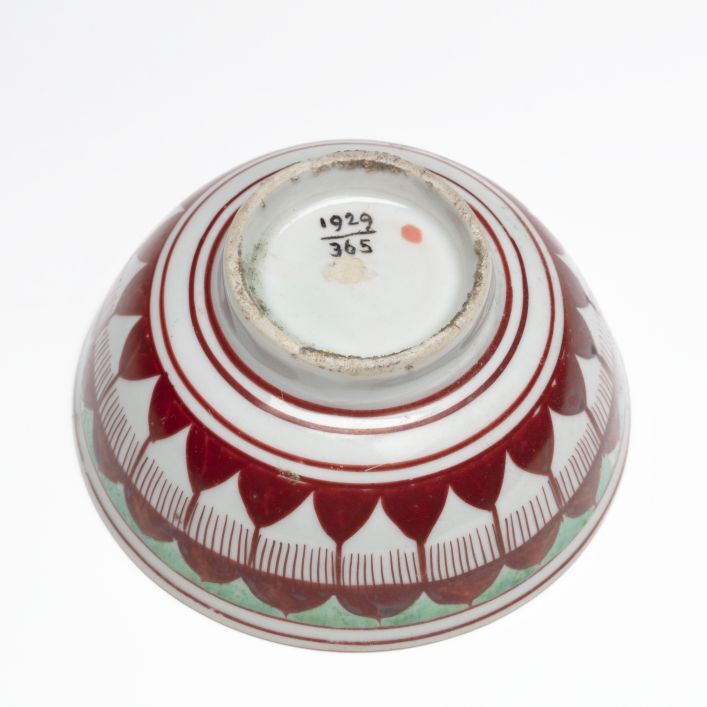 Kommetje met platte bodem, rechte voetring, bol-, later rechtspreidende wand. Versiering: in ijzerrood en groen glazuur. Ext.: banden en twee rijden gestyleerde bladen. Int.: rand van driehoekjes.||China||Keramiekmuseum Princessehof GRV 1929-408