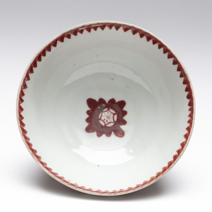 Kommetje met platte bodem, rechte voetring, bol-, later rechtspreidende wand. Versiering: in ijzerrood en groen glazuur. Ext.: banden en twee rijden gestyleerde bladen. Int.: rand van driehoekjes.||China||Keramiekmuseum Princessehof GRV 1929-408 |