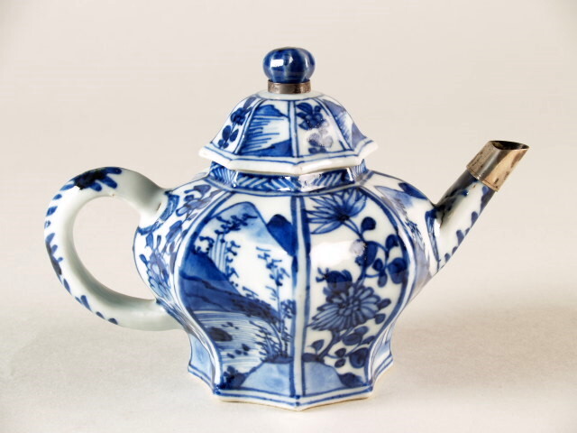 presentatietekst: Theepot, achthoekig, met decor van landschappen en planten op de 8 zijden (Nederlands) | |||||||||||||||