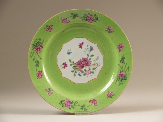 | Nederlands | Bord met decor van cartouche met bloemen op groen fond met bloemranken |