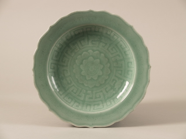 presentatietekst: Bord met accoladevormige rand en decor van meanders en bloem (Nederlands) | |||||||||||||||