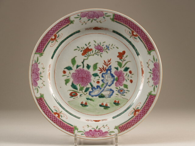 | Nederlands | Schotel met decor van bloemen en rots, famille rose |
