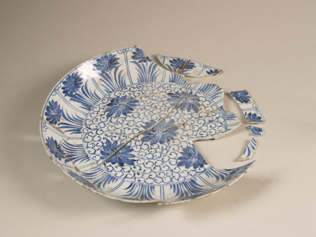 | Nederlands | Negen scherven van een schaal met schematisch decor van identieke bloemen |