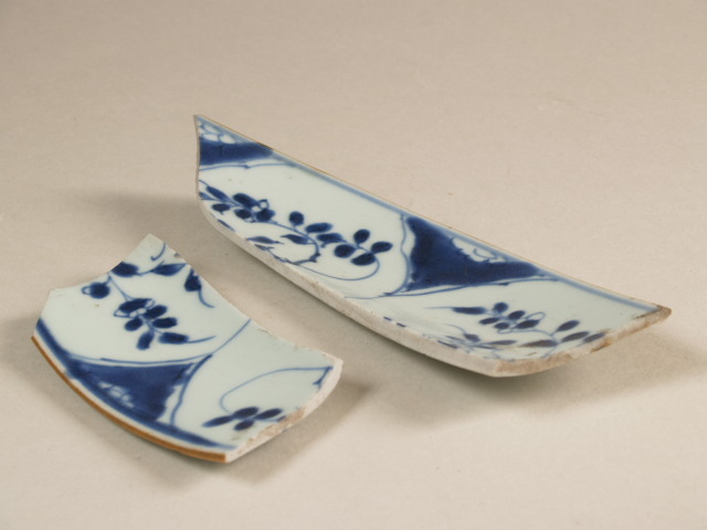 presentatietekst: Twee scherven van schaal met decor in onderglazuurblauw (Nederlands) | |||||||||||||||