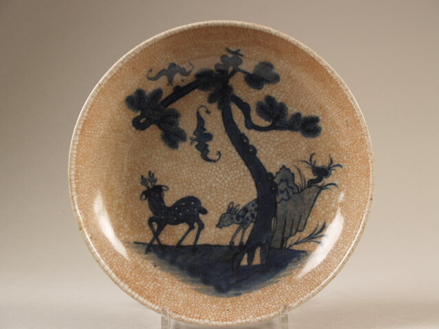 presentatietekst: Bord met decor in onderglazuurblauw van pijnboom en herten (Nederlands) | |||||||||||||||