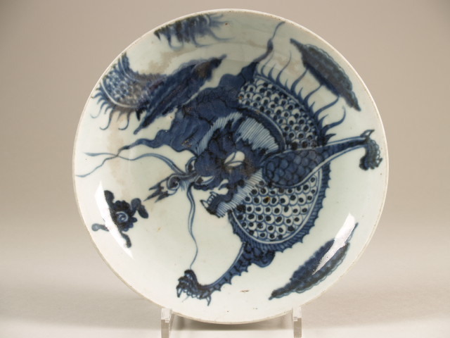 Schaal van porselein beschilderd in onderglazuur blauw. Op de voorzijde een grote, parel najagende draak met vier klauwen. De achterzijde met driemaal een tak (bamboe). Blauwwit. (Nederlands)