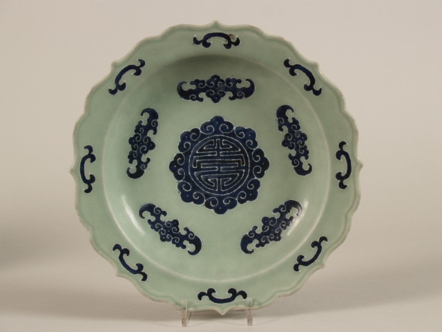 | Nederlands | Bord met geschulpte rand en decor van karakter Shou en gestileerde vleermuizen, celadon |