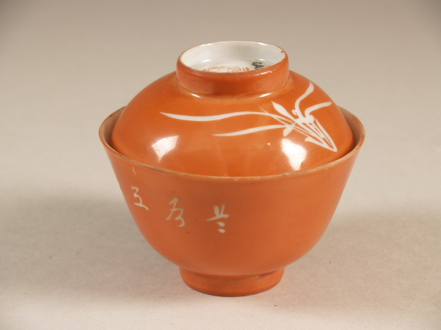 | Nederlands | Soepkom met deksel bedekt met ijzerrood glazuur en uitgespaarde bamboeversiering en karakters |