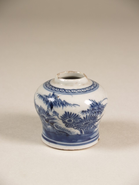 presentatietekst: Miniatuurpot zonder deksel en decor van landschap met bloemen (Nederlands) | |||||||||||||||