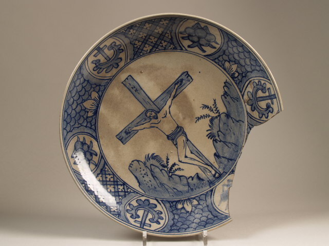 | Nederlands | Schaal met decor van de kruisiging, groot stuk mist, 2 ingelijmde scherven |
