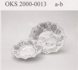 2 schotels met geplooide en gehoekte rand en polychroom decor van landschap met 2 mandarijneenden (Q26700): verschil tussen versies