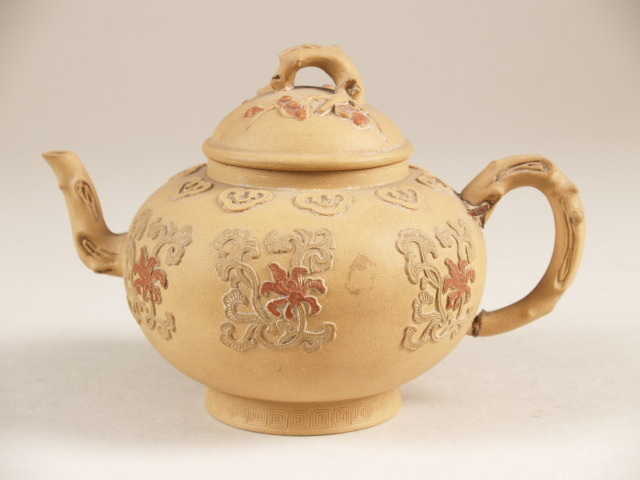 Theepot met oor, tuit en knop in de vorm van takken en opgelegd decor van bloemranken