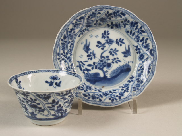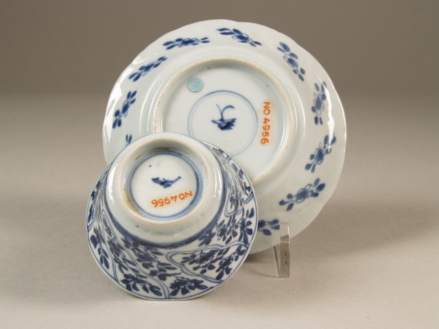 Kop en schotel met gegolfde rand en decor van peterselie in gedraaide vakken, 1 van 5 incomplete (Q27151): verschil tussen versies