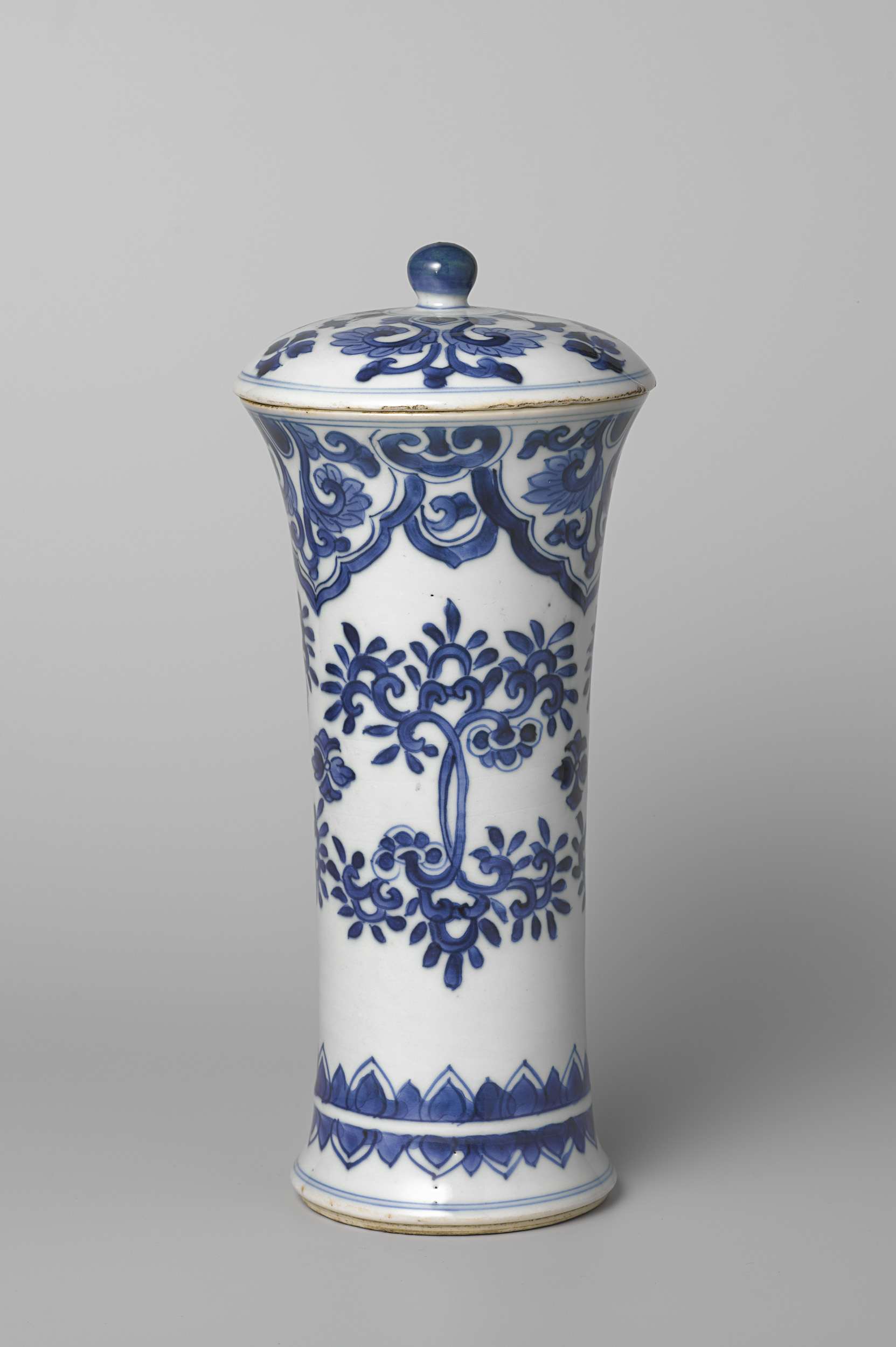 Covered cylindrical beaker with flower scrolls | |||||||||||||||