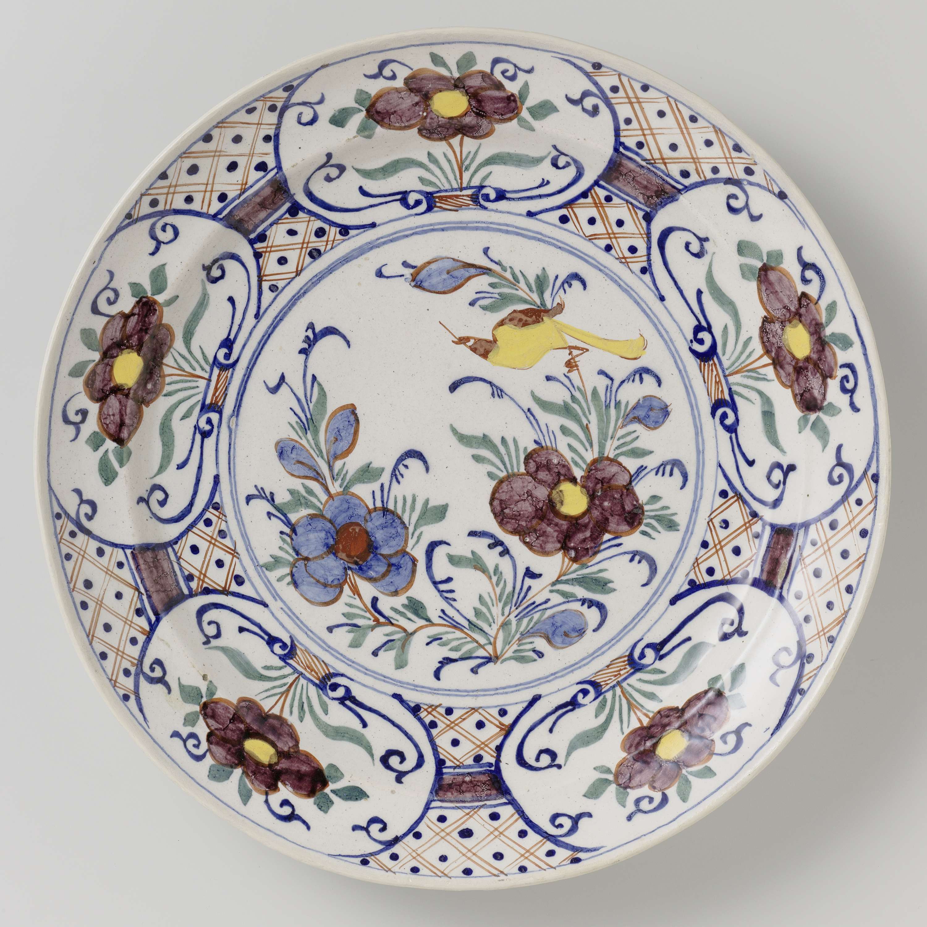 Ronde schotel van veelkleurig beschilderde faience, met op het plat een cirkel waarbinnen een veelkleurige vogel en bloemen. Om de cirkel is een ruitmotief met stippen geschilderd, waarin vijf ovale vakken met bloemen in de kleuren geel en mangaan. De achterzijde is gemerkt met het getal 5. (Nederlands)
