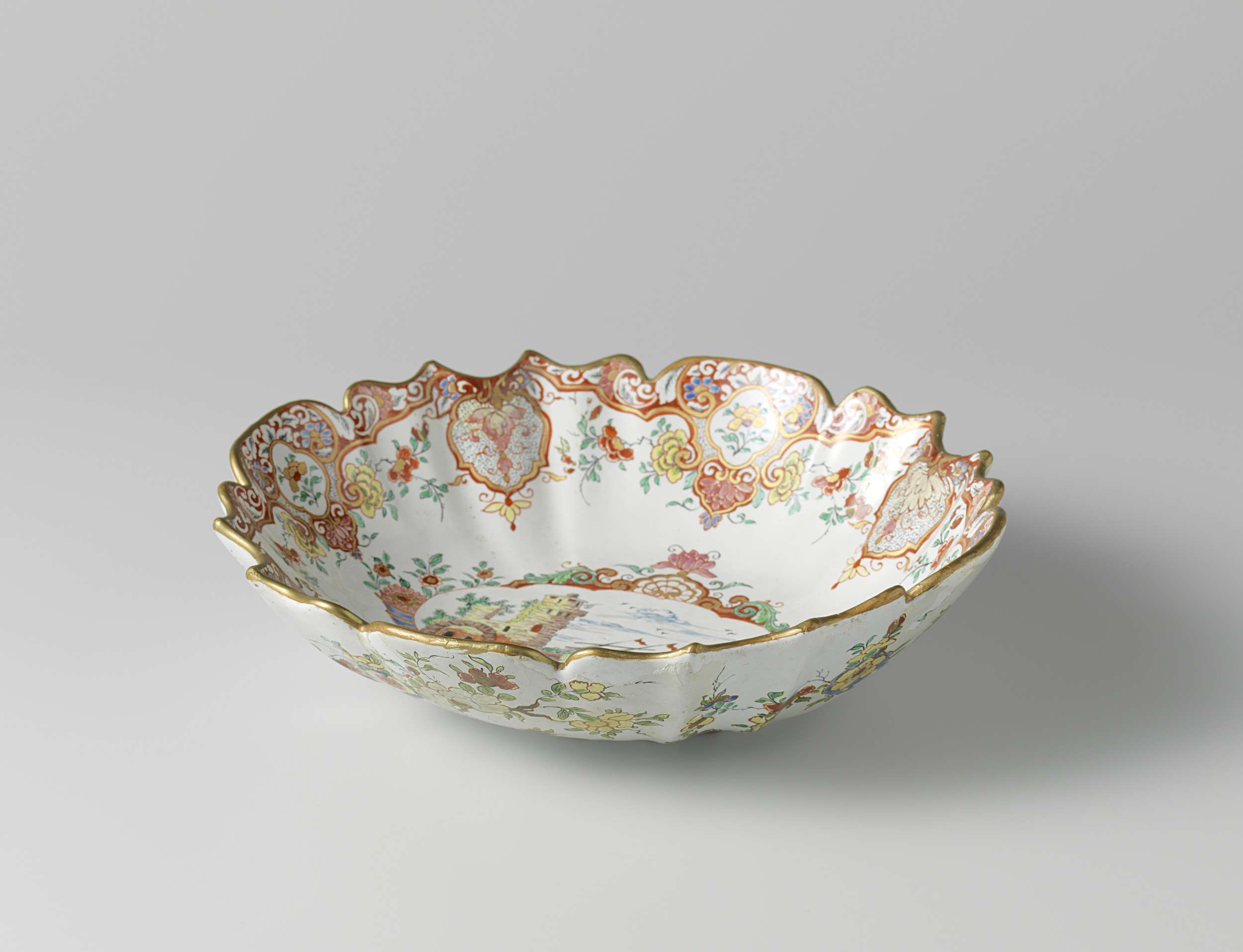 Schaal met geschulpte rand veelkleurig beschilderd met een Italianiserend landschap in een cartouche. Langs de rand lambrequins. (Nederlands)