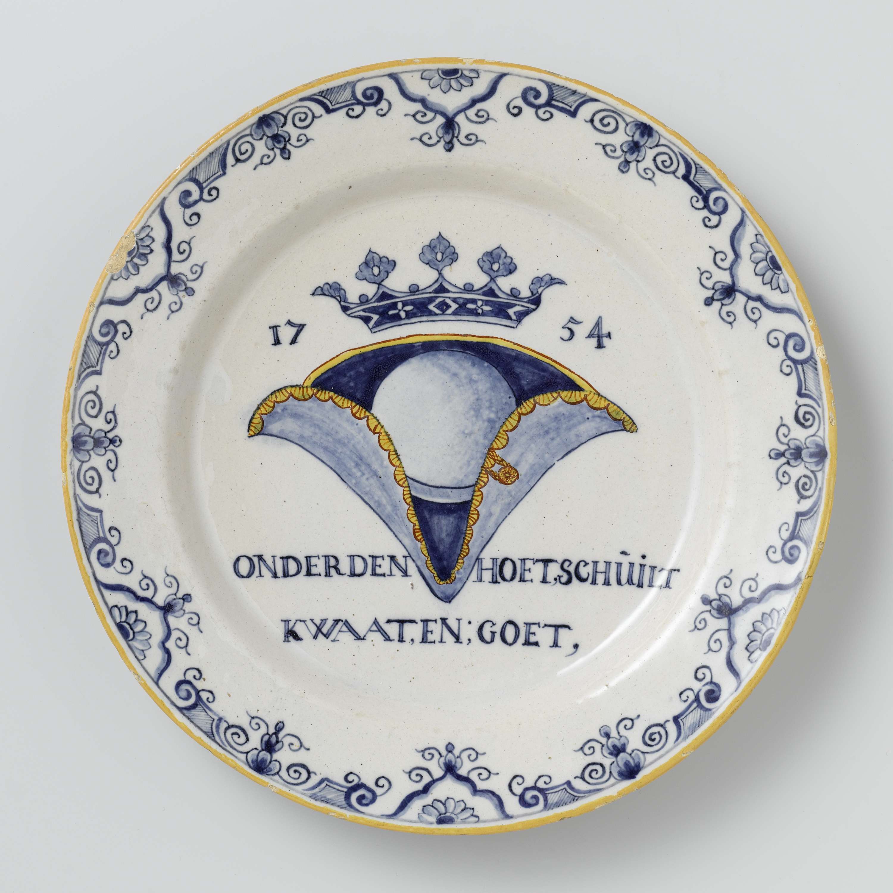 Bord van faience. Veelkleurig beschilderd met een gekroonde hertogshoed en de tekst: ONDER DEN HOET SCHUILT // KWAAT, EN; GOET,. (Nederlands)