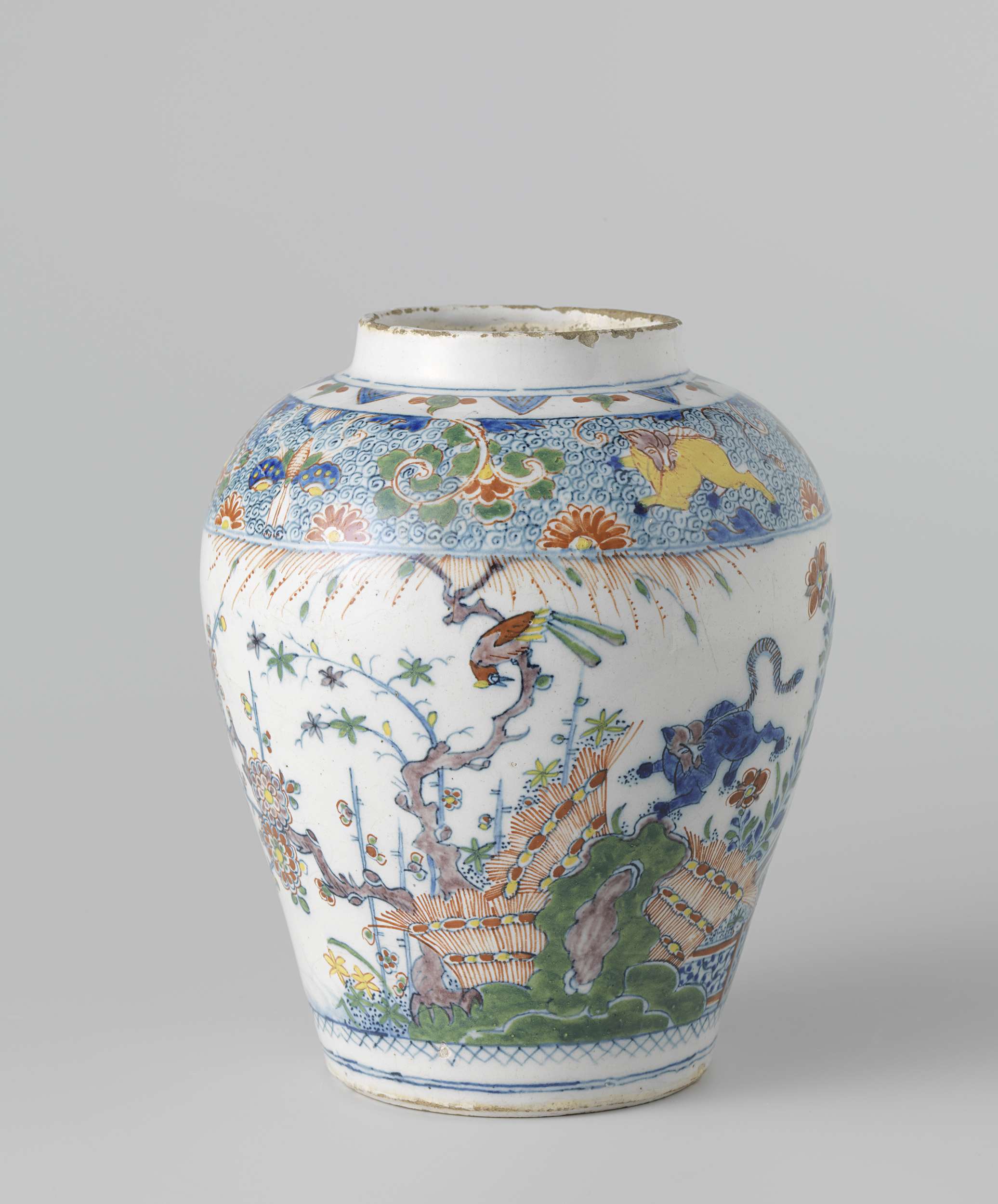 Pot (zonder deksel) van faience. Veelkleurig gedecoreerd. (Nederlands)