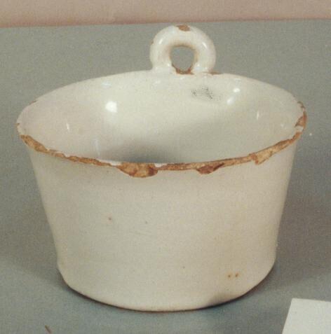 ronde zeepbak met licht schuine wand; verticale ringvormige opstaande handgreep; ongedecoreerd; ongeglazuurd standvlak (Nederlands)