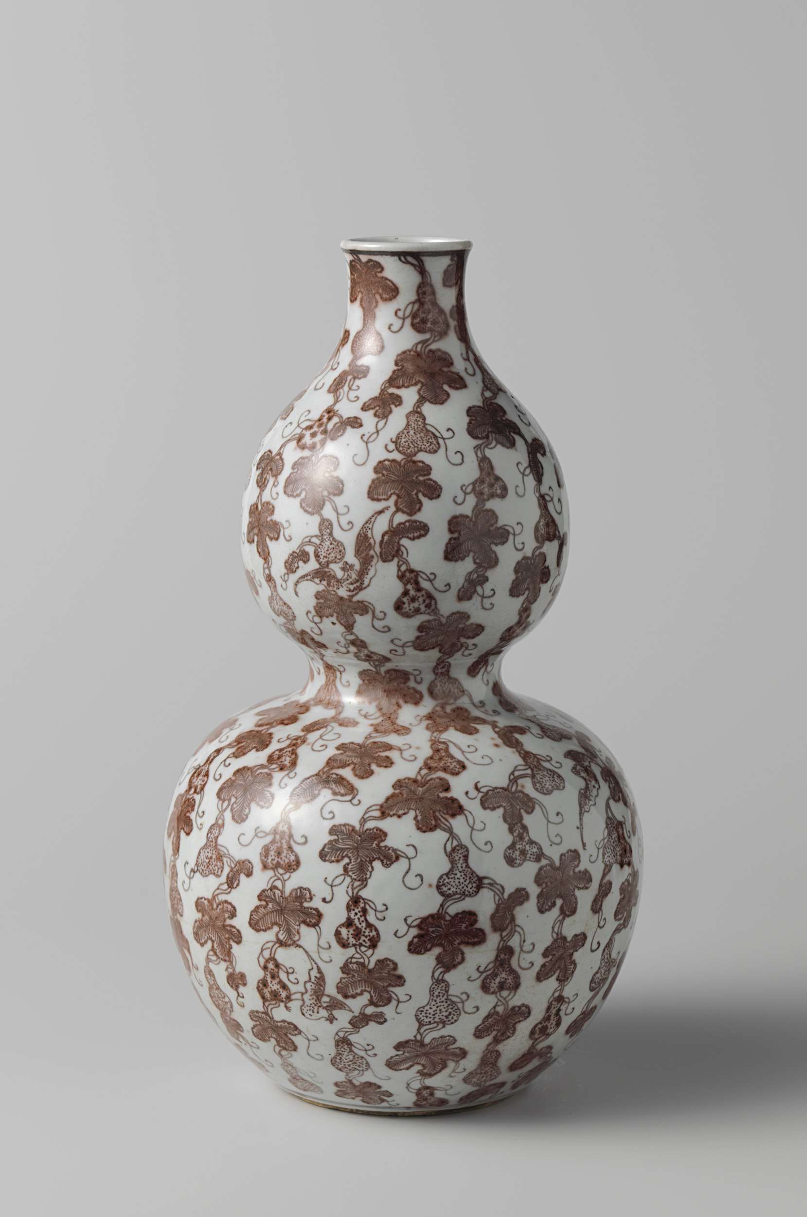 Kalebasvormige fles van porselein met een iets spreidende rand, beschilderd in onderglazuur rood met een doorlopende decoratie van kleine kalebassen, bladeren en ranken met hiertussen vleermuizen. Op de onderzijde een oud label met: Royal Academy of Arts, London/ International Exhibition of Chinese Art, 1935-6/ Ser. Nos. 1054/ Owner R. May, Zeist, Holland en een gescheurd oud label met: Vrienden der Aziatische Kunst. Onderglazuur koperrood. (Nederlands)