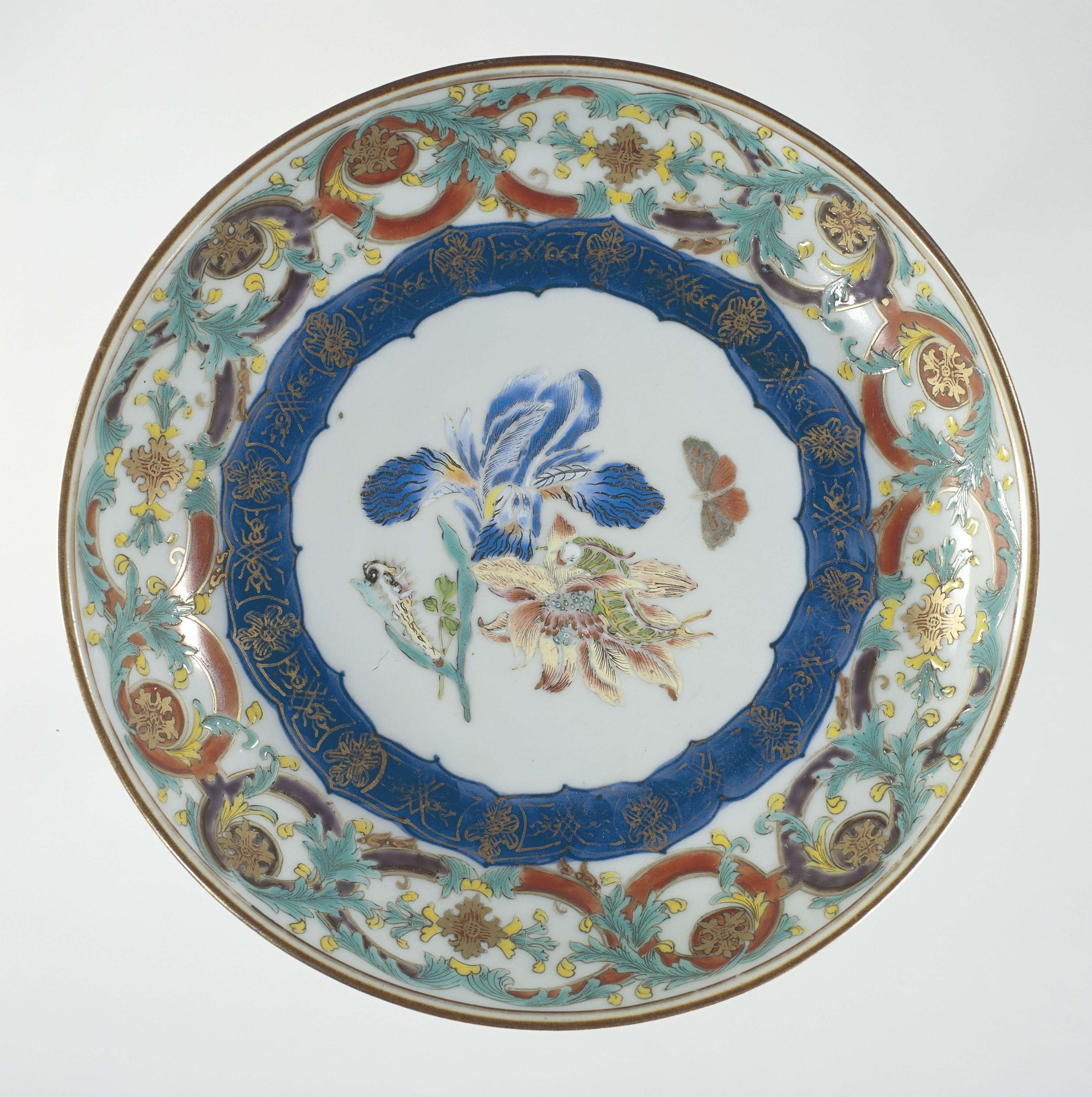 Schaal van porselein met ronde wand, beschilderd in onderglazuur blauw en op het glazuur in blauw, rood, roze, groen, geel, zwart en goud. Op het plat twee bloemtakken (iris, anemoon) waarop twee rupsen, ernaast een vliegende vlinder; hieromheen een decoratieve band in onderglazuur blauw met goud; de wand een band met een geschakeld patroon met bladranken; de buitenrand met een band servetwerk. Europese voorstelling in emailkleuren. (Nederlands)