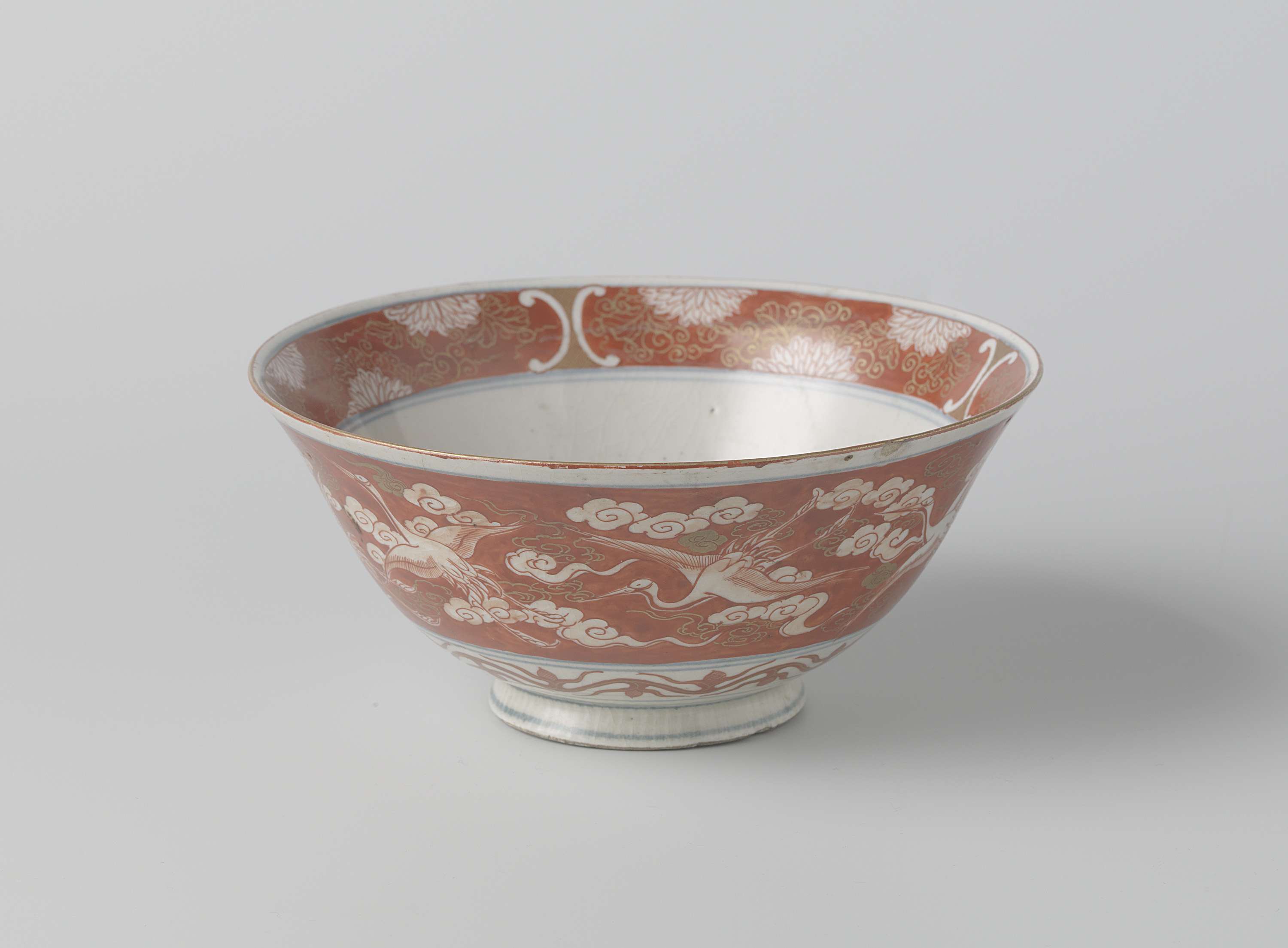 Kom, met decor van vliegende kraanvogels en wolken in ijzerrode grond met goud. (Nederlands)