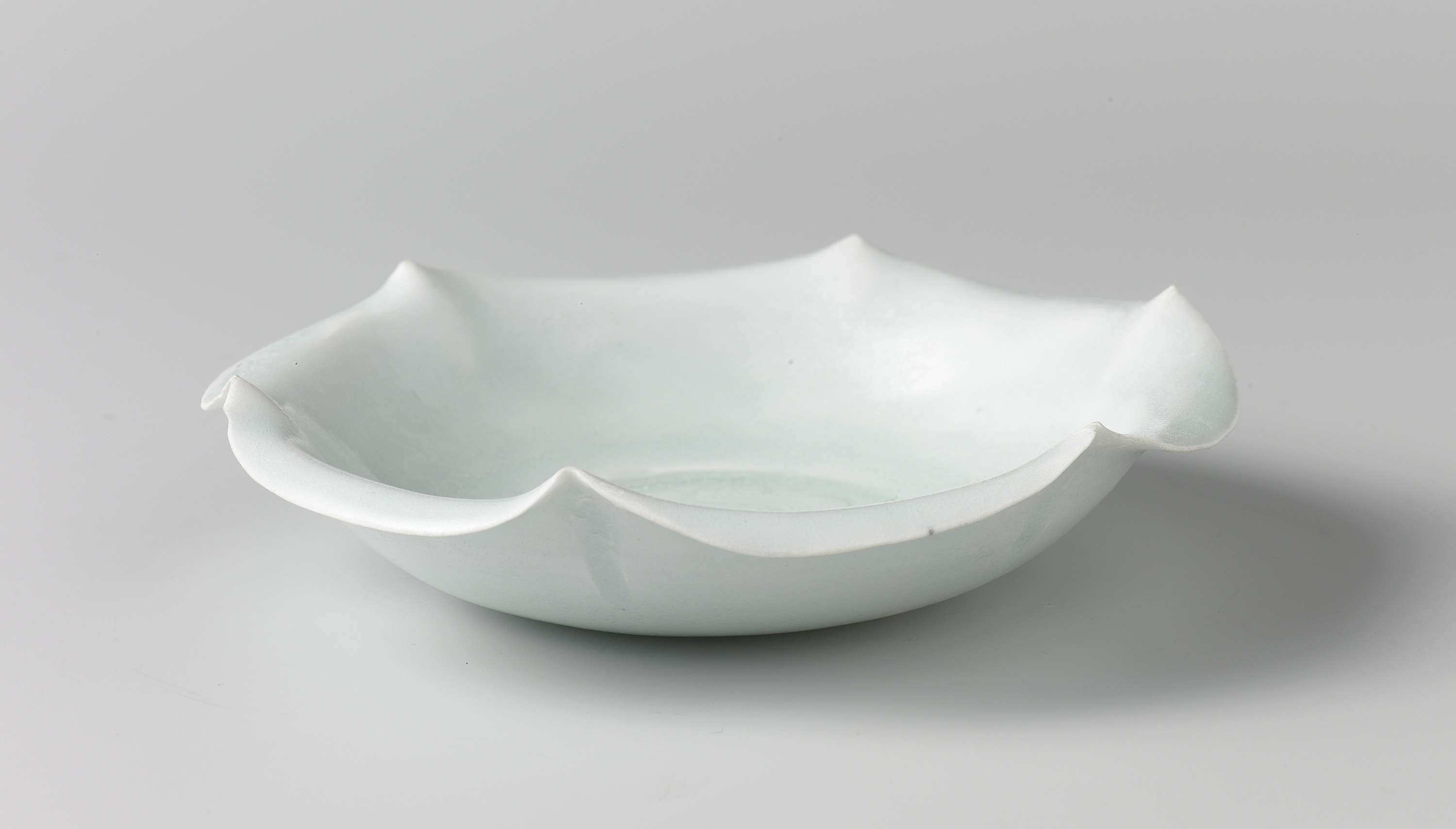 Schaal van steengoed gemodelleerd in de vorm van een bloem met zes bladeren, bedekt met een transparant glazuur met een lichtblauwe tint. Op het plat een medaillon met daarin ingegrifte bladranken. Bakzand op de onderzijde. Qingbai. (Nederlands)