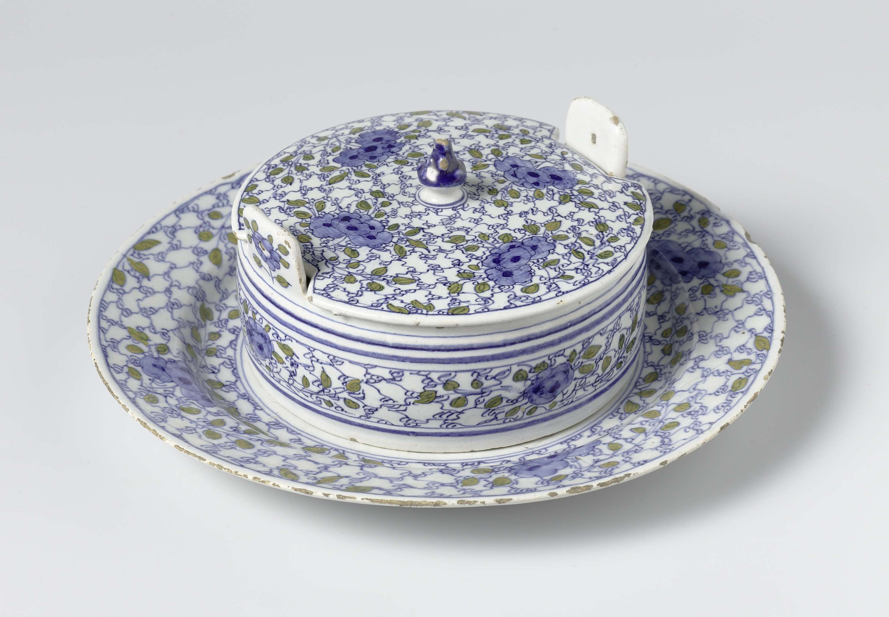 Botervloot van veelkleurig beschilderde faience, met een deksel en op een onderschotel. In het midden van het plat van de onderschotel is een klein rozenboeket geschilderd. De botervloot is versierd met fijne lovertakjes, blauwe rozen en groene bladeren. Het deksel heeft een blauwe knop en de in de onderschotel staat het getal 12. Bij de botervloot hoort een identieke botervloot met invnr. BK-NM-11849-a. (Nederlands)