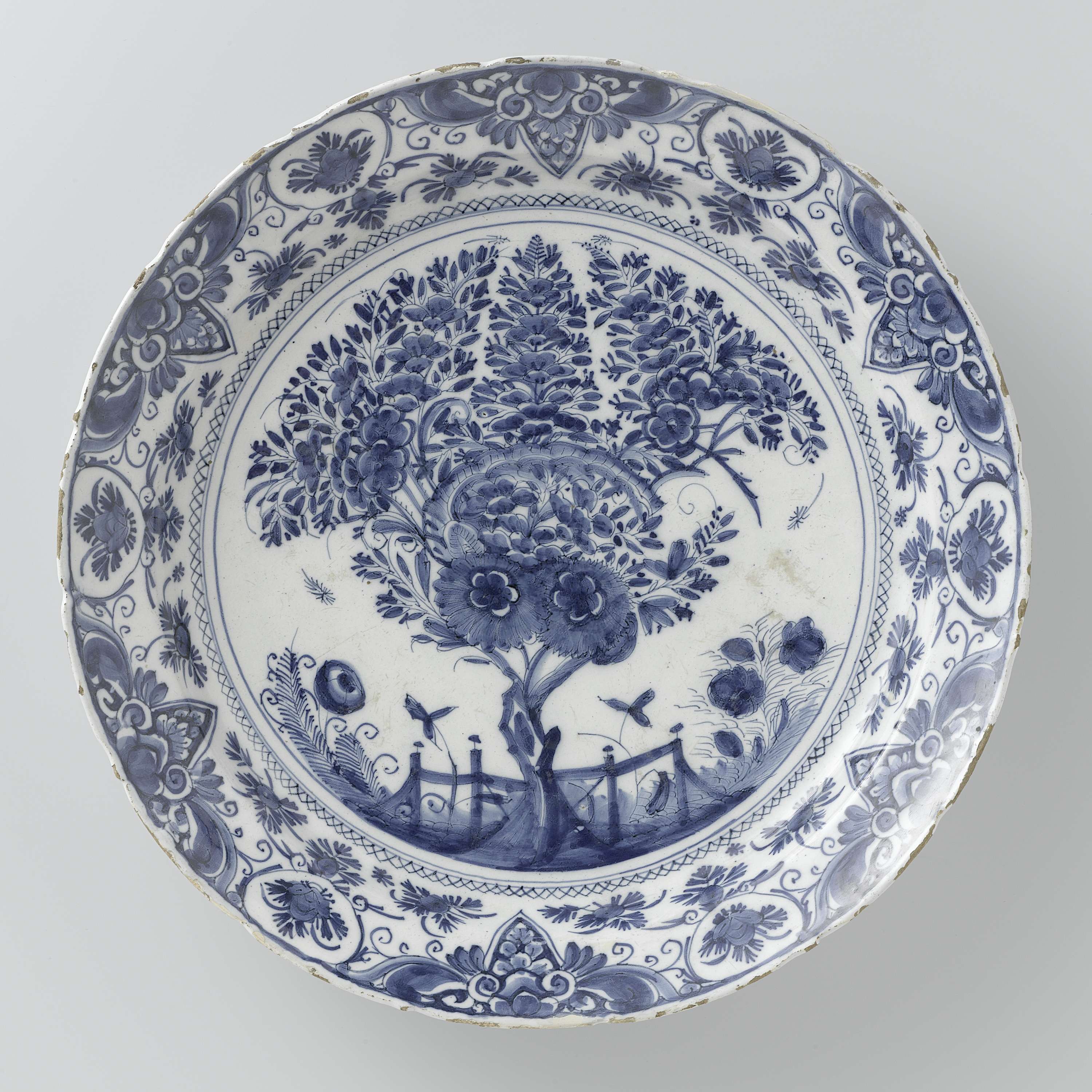 Schotel van faience. Blauw beschilderd met een fantasie-boom. (Nederlands)