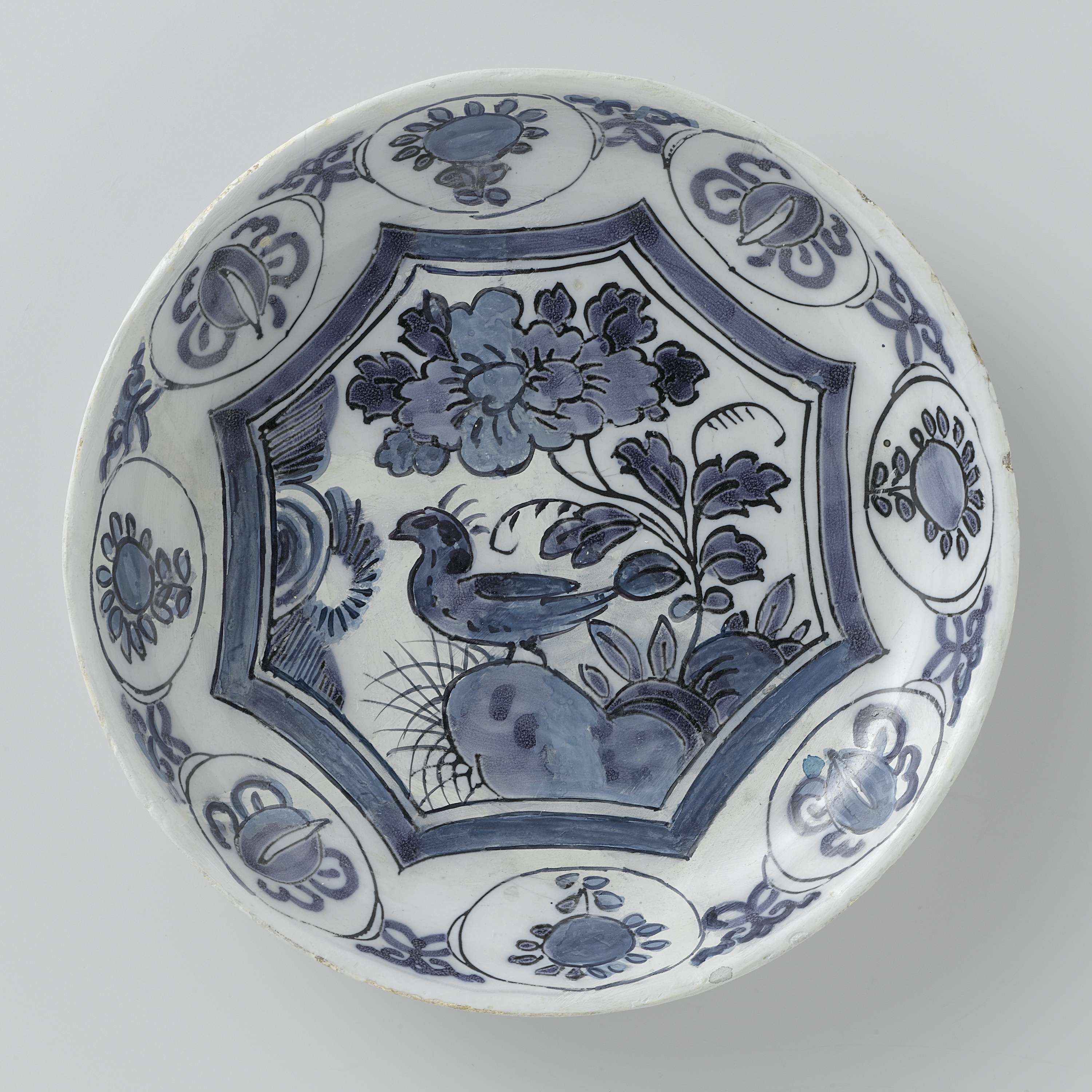 Ronde schotel van blauw beschilderde faience. Op het plat is binnen een achtpas een vogel onder een plant geschilderd en op de rand Chinese motieven. De schotel is een bodemvondst. (Nederlands)